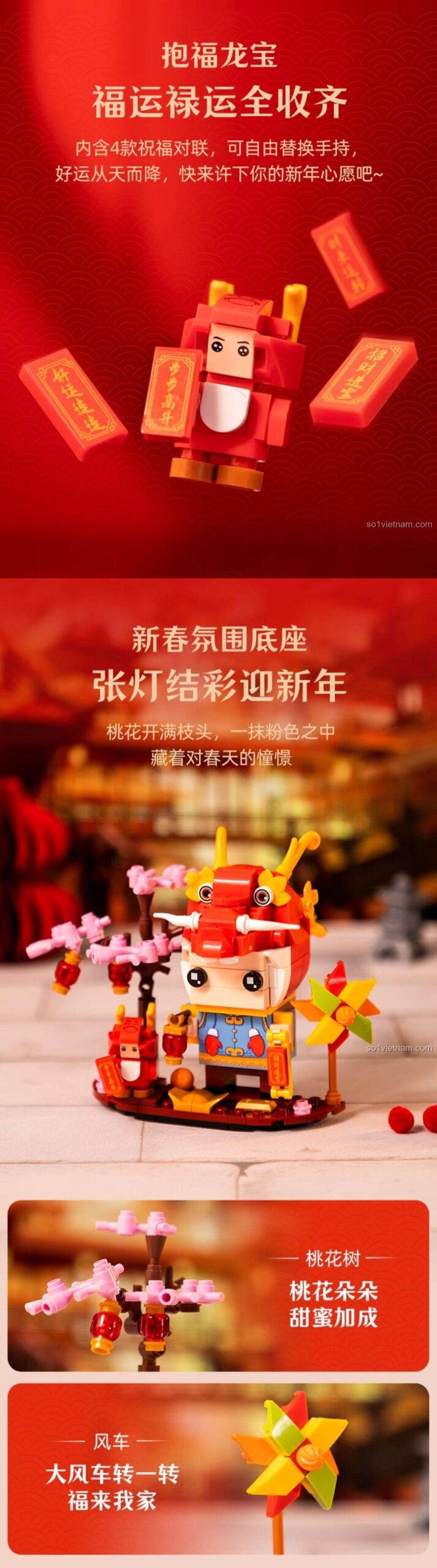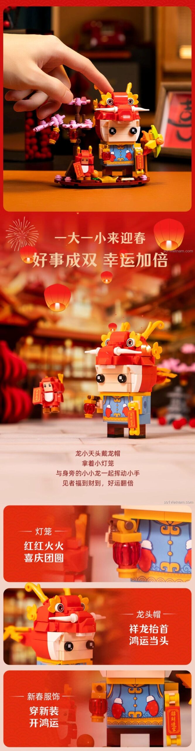 Bộ lắp ghép Rồng Nhỏ Bé Pantasy 99005 nổi bật với thiết kế “方头仔” (Fangtouzai – Khối vuông nhỏ) độc đáo, tạo nên một chú rồng con vô cùng đáng yêu và ngộ nghĩnh. Mô hình được chăm chút tỉ mỉ đến từng chi tiết, từ chiếc mũ rồng uy nghiêm, đôi mắt lanh lợi, bộ trang phục truyền thống đến các phụ kiện đi kèm như đèn lồng đỏ rực, cây đào nở rộ, quạt gió xoay tròn và những chiếc bao lì xì mang lời chúc tốt đẹp.