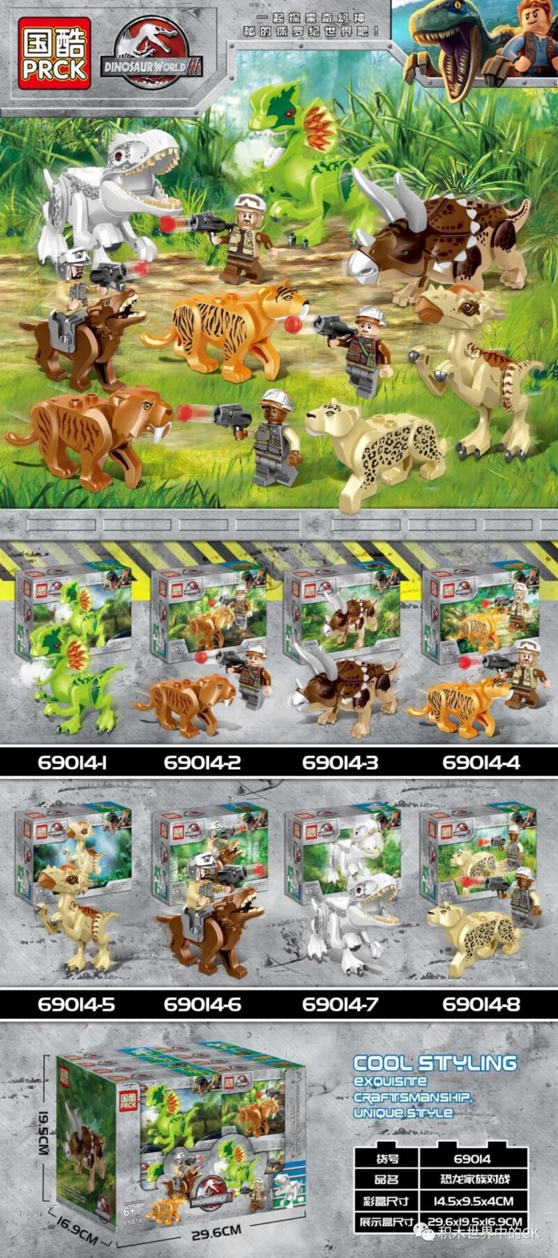 Bộ lắp ghép PRCk 69014 tái hiện sinh động các loài khủng long quen thuộc như T-Rex, Triceratops, Velociraptor, cùng với các nhân vật người điều khiển, mang đến một bức tranh toàn cảnh về cuộc chiến sinh tồn đầy kịch tính. Mỗi chi tiết đều được thiết kế tỉ mỉ, màu sắc tươi sáng, mô phỏng chân thực hình dáng và đặc điểm của từng loài khủng long, kích thích trí tưởng tượng và sự tò mò của trẻ.