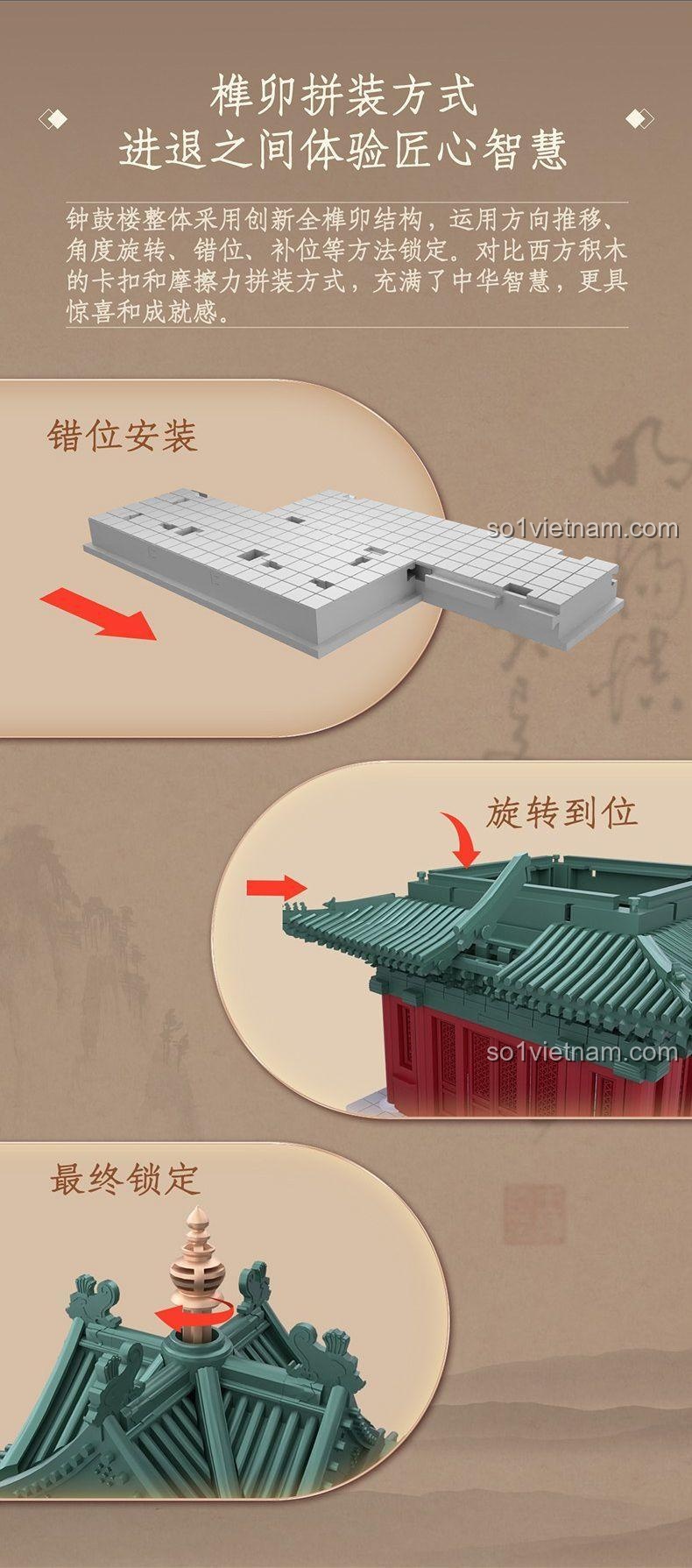 Điểm nhấn nổi bật nhất của bộ lắp ghép Qiannian Sun QNSZL24AIQI Mô hình Tháp Trống Tây An chính là cấu trúc ghép mộng truyền thống Trung Hoa. Thay vì các chốt nối thông thường, các khối lắp ghép mộng được thiết kế để lồng vào nhau một cách chính xác, tạo nên sự liên kết chặt chẽ và vững chắc mà không cần đến lực ma sát quá lớn. Mỗi mảnh ghép đều được gia công tỉ mỉ, đảm bảo độ chính xác cao, giúp quá trình lắp ráp diễn ra mượt mà và thú vị. Bạn sẽ được trải nghiệm cảm giác như một nghệ nhân cổ đại, tự tay xây dựng một công trình kiến trúc phức tạp bằng trí tuệ và sự khéo léo. Các loại mộng như mộng lùi, mộng thẳng, chốt xuyên, mộng cài, mộng chữ T và mộng đuôi én đều được tái hiện, mang đến một cái nhìn sâu sắc về kỹ thuật xây dựng truyền thống. Tính năng đặc biệt này không chỉ là một thử thách hấp dẫn mà còn là một bài học thực tế về kỹ thuật và triết lý cân bằng trong kiến trúc cổ Trung Quốc.