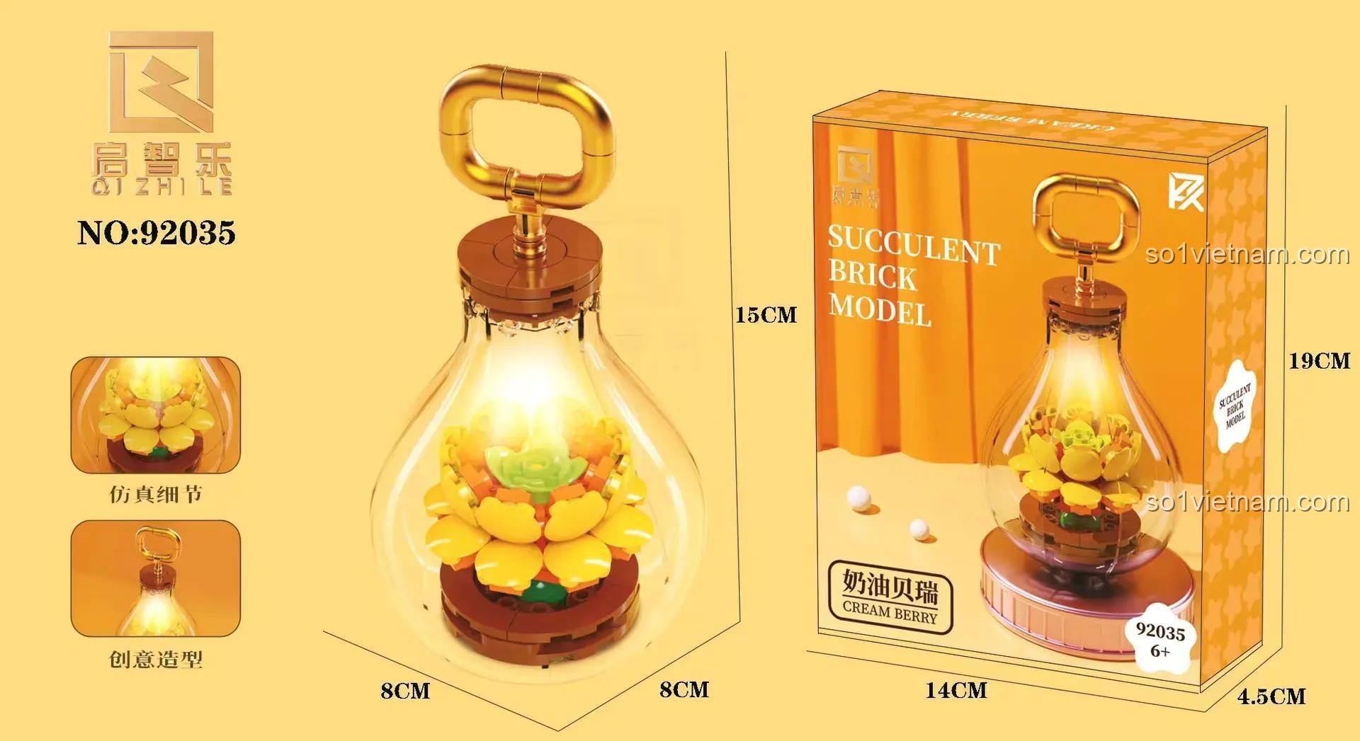 Bộ đồ chơi mô hình Cây mọng nước trong đèn 2035 của Qizhile là một minh chứng cho sự tinh tế trong thiết kế. Với kích thước nhỏ gọn 8x8x15cm, mô hình này dễ dàng đặt ở bất cứ đâu, từ bàn học, bàn làm việc đến kệ sách. Các chi tiết được tái hiện sống động với màu sắc chủ đạo là vàng, xanh lá, trắng và cam, tạo nên một tổng thể hài hòa và bắt mắt. Từng “lá” cây mọng nước được thiết kế tỉ mỉ, mô phỏng chân thực vẻ ngoài của loài Cream Berry. Đặc biệt, phần vỏ đèn trong suốt bao bọc bên ngoài không chỉ bảo vệ mô hình mà còn tạo hiệu ứng lung linh khi đèn LED được bật sáng. Đây là một kiệt tác thu nhỏ, nơi mỗi mảnh ghép đều góp phần tạo nên một vẻ đẹp hoàn hảo, kích thích thị giác và khơi gợi trí tưởng tượng cho bé gái 6 tuổi.