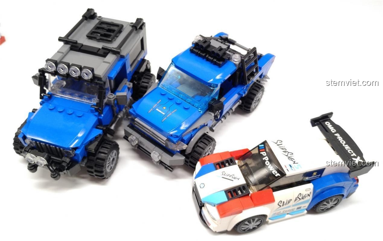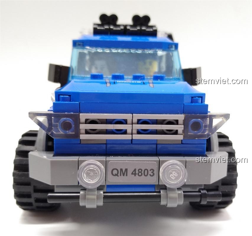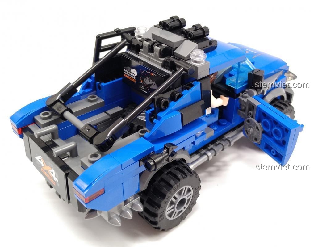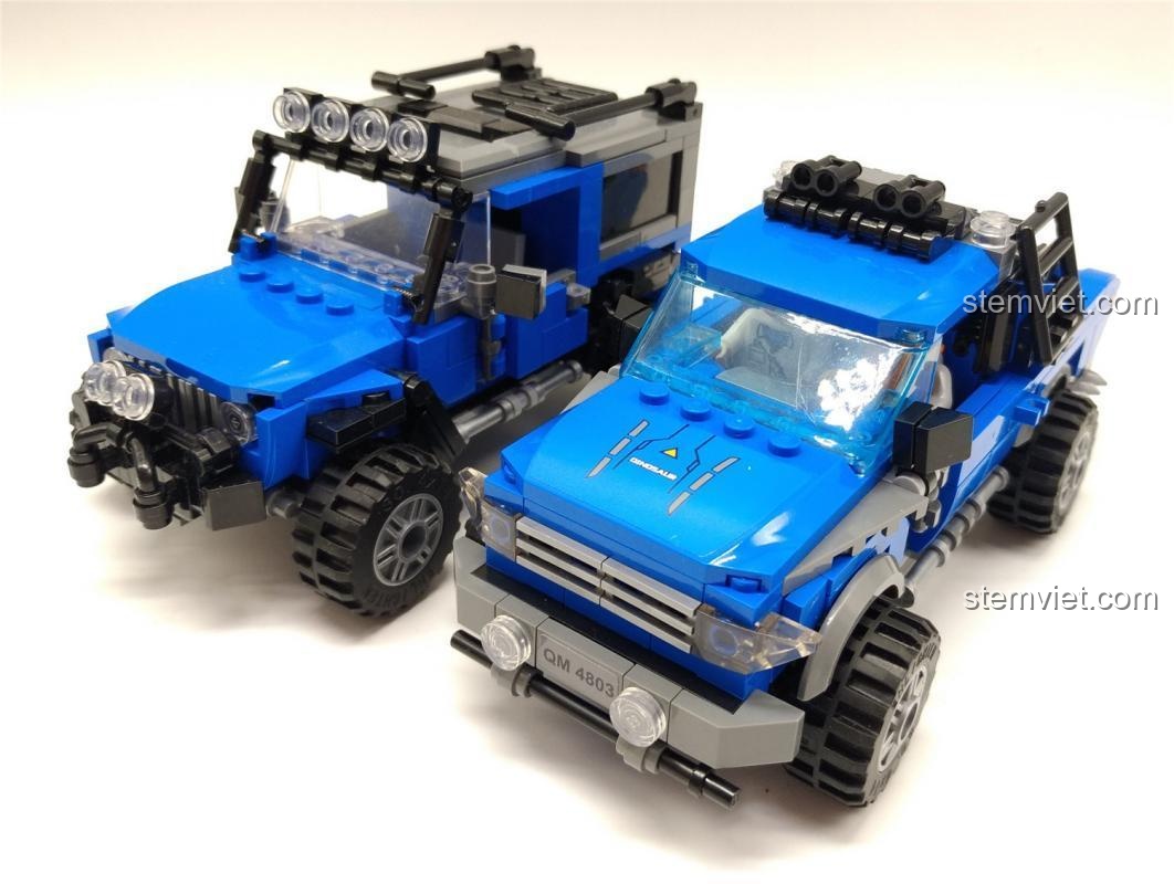 Không chỉ dừng lại ở khủng long, bộ đồ chơi mô hình QMAN này còn cho phép bé lắp ráp thành hai mẫu xe địa hình ấn tượng. Chiếc xe SUV địa hình và xe bán tải đều sở hữu thiết kế hầm hố, với lốp xe lớn, đèn pha phụ và các chi tiết nội thất như vô lăng, ghế ngồi, cần số. Đặc biệt, các cửa xe có thể mở ra, tăng thêm tính tương tác và chân thực cho mô hình. Sự kết hợp giữa các mảnh ghép màu xanh dương, xám và đen không chỉ tạo nên vẻ ngoài bắt mắt mà còn giúp bé dễ dàng nhận biết và phân loại các bộ phận trong quá trình lắp ráp, từ đó rèn luyện khả năng quan sát và tư duy không gian.