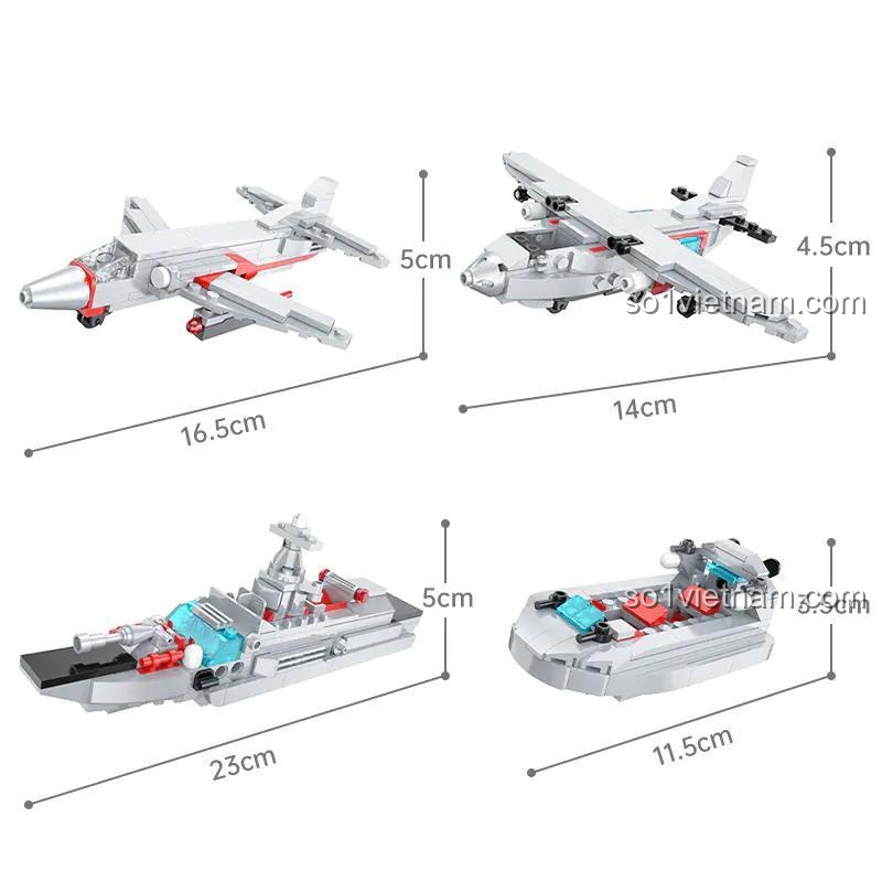 Bộ đồ chơi mô hình DZ0135 của Qman gây ấn tượng mạnh với thiết kế đa dạng và chi tiết. Mô hình chính là một chiếc tàu sân bay quân sự có kích thước ấn tượng: dài 40.8cm, rộng 9.7cm và cao 9.3cm, tái hiện chân thực một chiến hạm khổng lồ. Với màu sắc chủ đạo là xám, kết hợp các điểm nhấn đỏ, xanh dương, trắng và đen, mô hình toát lên vẻ mạnh mẽ, hiện đại của một phương tiện quân sự. Không chỉ dừng lại ở tàu sân bay, bộ lắp ghép này còn cho phép bé trai 6 tuổi lắp ráp thêm 32 mô hình khác, bao gồm nhiều loại máy bay chiến đấu, trực thăng, tàu chiến, xe tăng và các phương tiện quân sự khác. Mỗi mô hình đều được thiết kế tỉ mỉ, đảm bảo độ chính xác và tính thẩm mỹ cao, giúp bé hình dung rõ ràng hơn về các loại khí tài quân sự. Từ những chi tiết nhỏ nhất đến tổng thể hoành tráng, Qman DZ0135 mang đến trải nghiệm lắp ráp và trưng bày đầy tự hào.