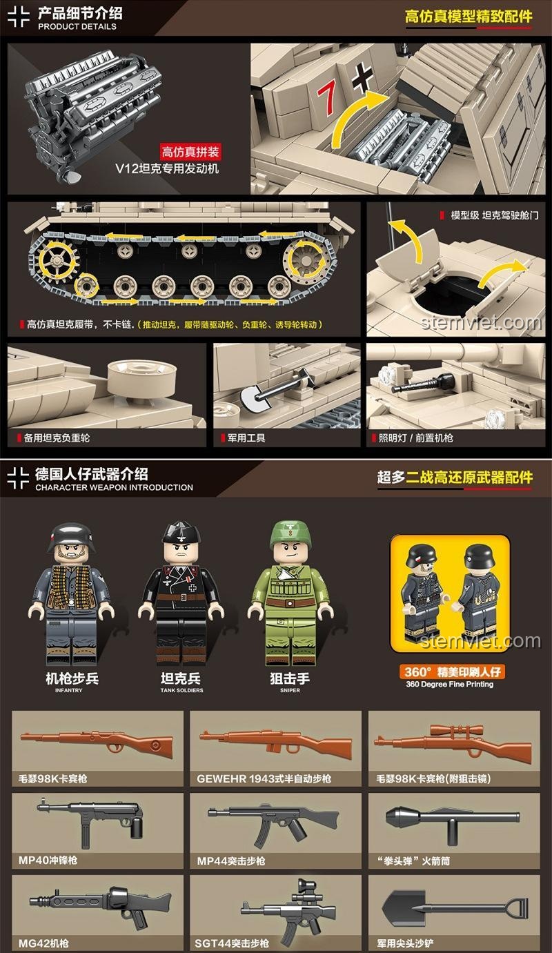 Bên cạnh đó, mô hình còn được trang bị động cơ V12 chi tiết, dù không có chức năng hoạt động thực tế nhưng vẫn là một điểm nhấn thẩm mỹ ấn tượng, thể hiện sự tinh xảo trong thiết kế. Các chi tiết mô phỏng đèn pha và súng máy phía trước càng làm tăng thêm vẻ hầm hố và mạnh mẽ cho chiếc xe tăng. Đặc biệt, bộ đồ chơi mô hình 67 còn đi kèm với nhiều phụ kiện vũ khí Thế chiến II đa dạng như súng trường Mauser 98K, súng tiểu liên MP40, súng máy MG42, và tên lửa chống tăng Panzerschreck, giúp bé thỏa sức trang bị cho các minifigure và tạo ra những trận chiến hoành tráng.