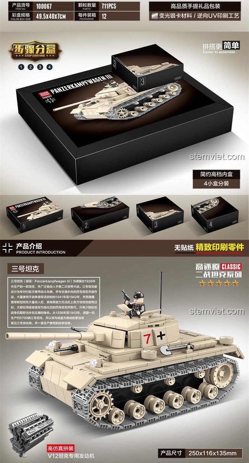 Bộ lắp ráp Xe Tăng Quân Sự Đức QUANGUAN 100067 là một minh chứng cho sự tỉ mỉ và tinh xảo trong thiết kế. Với 711 mảnh ghép, mô hình này tái hiện chân thực từng đường nét của chiếc Panzer III huyền thoại, mang đến một trải nghiệm lắp ráp đầy thử thách và mãn nhãn cho các bé trai.