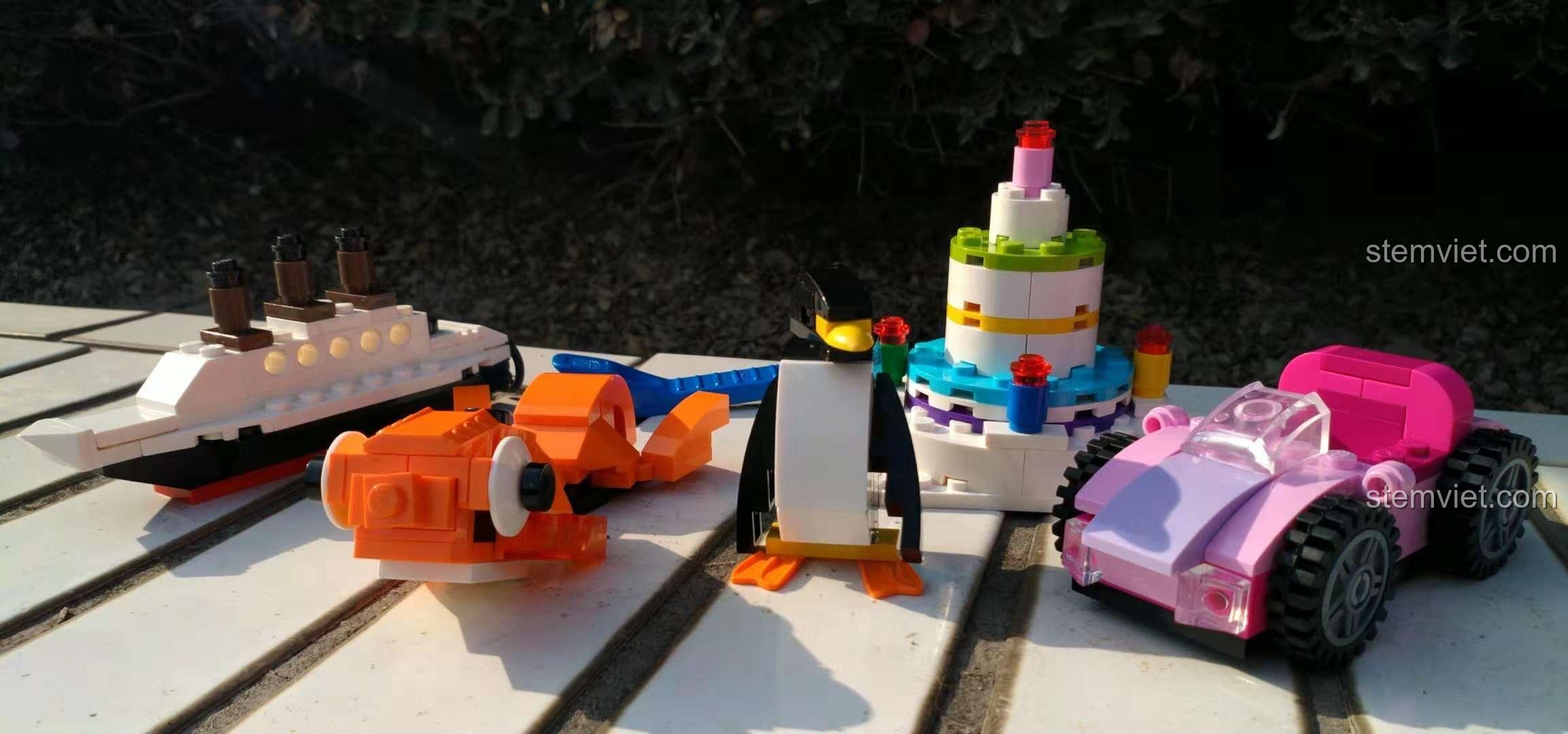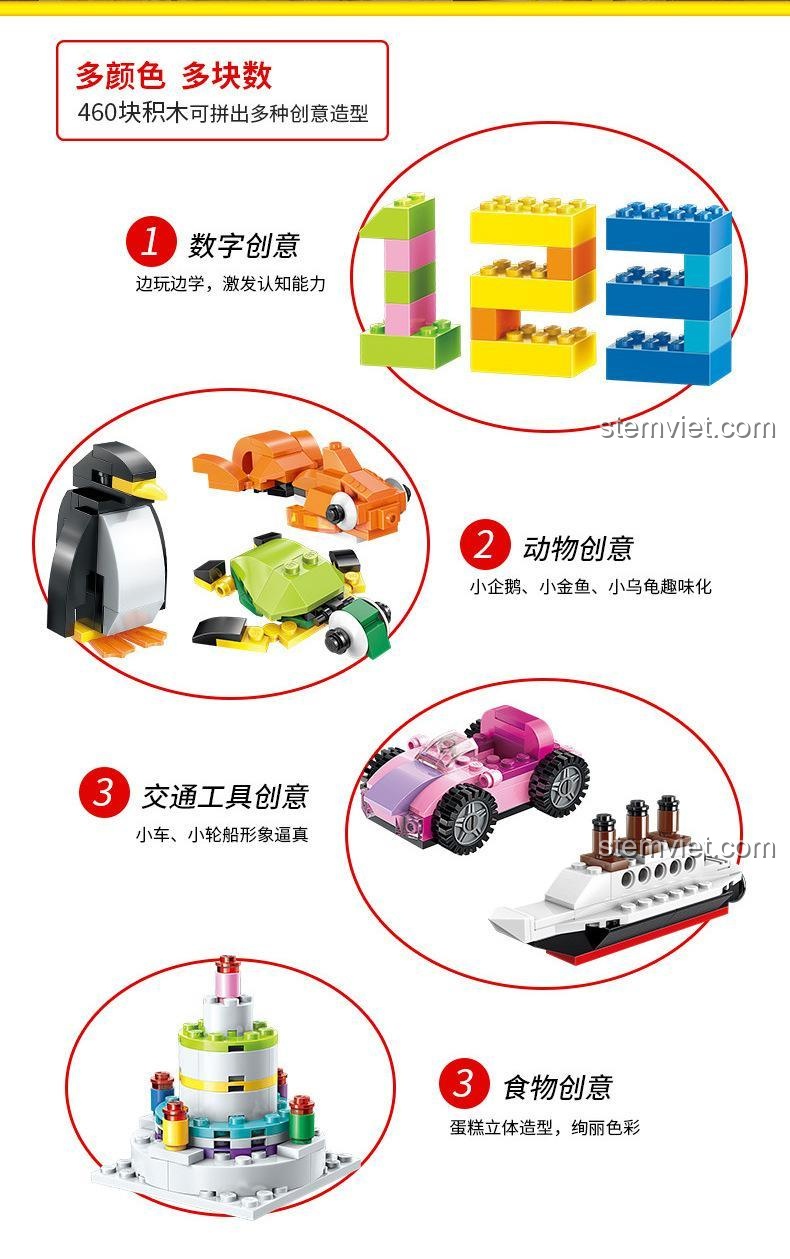 Với 460 chi tiết đa dạng, bé có thể tự do lắp ráp thành nhiều mô hình khác nhau, từ những con số ngộ nghĩnh, các loài động vật đáng yêu như chim cánh cụt, cá, rùa, đến các phương tiện giao thông như xe hơi, tàu thuyền, hay thậm chí là những món ăn hấp dẫn như bánh kem. Khả năng lắp ráp đa dạng này giúp bé không ngừng khám phá và thử nghiệm những ý tưởng mới, phát huy tối đa sự sáng tạo của bản thân.