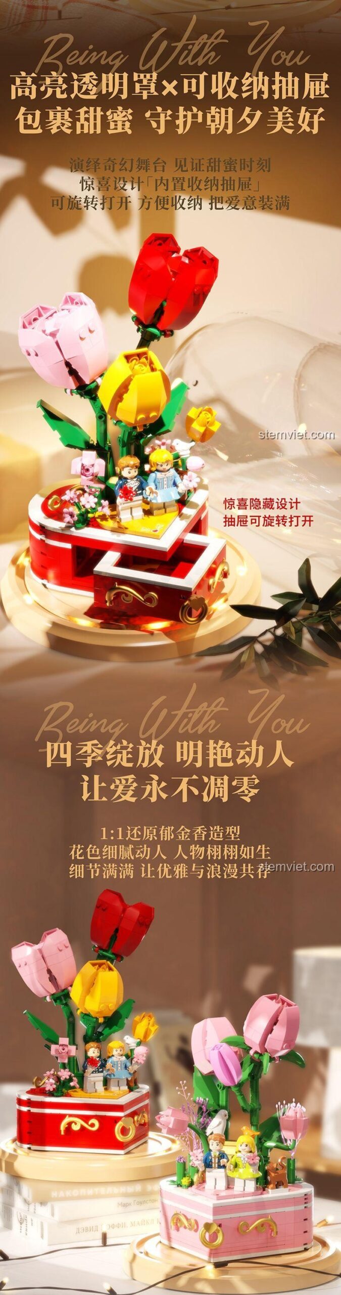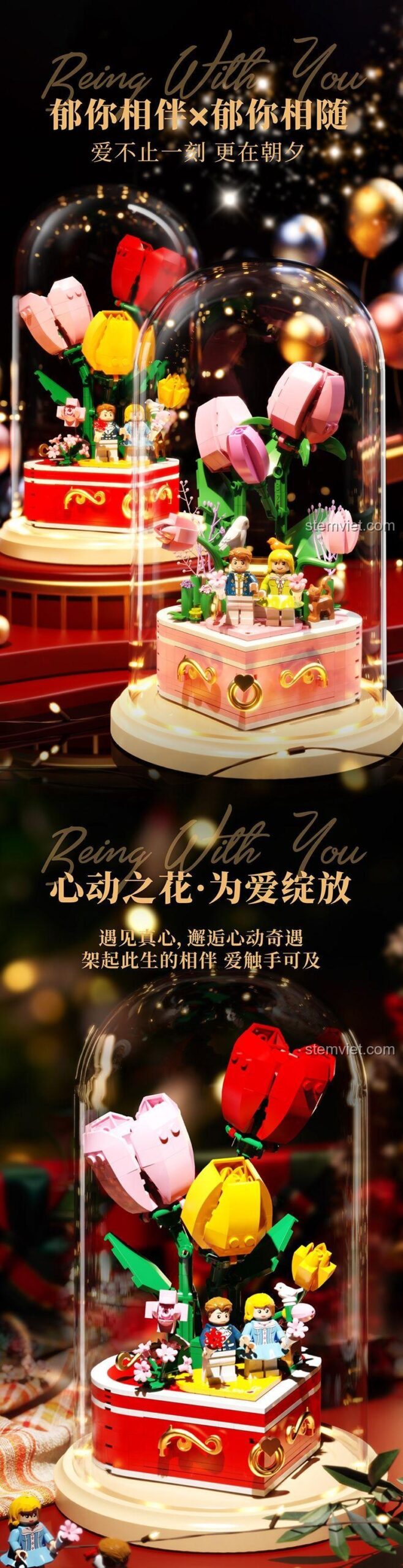 Bên cạnh đó, chiếc lồng kính bảo vệ không chỉ là yếu tố thẩm mỹ mà còn là một tính năng cơ bản quan trọng. Nó giúp giữ cho bó hoa tulip luôn sạch sẽ, tránh bụi bẩn và hư hại, đảm bảo vẻ đẹp vĩnh cửu của mô hình. Sự kết hợp giữa thiết kế tinh xảo và tính năng bất ngờ này khiến đồ chơi xếp hình Hoa vĩnh cửu lắp ráp QUNO 88001 trở thành một món quà không chỉ đẹp mà còn mang tính ứng dụng cao, khơi gợi trí tưởng tượng và sự sáng tạo không giới hạn ở bé.