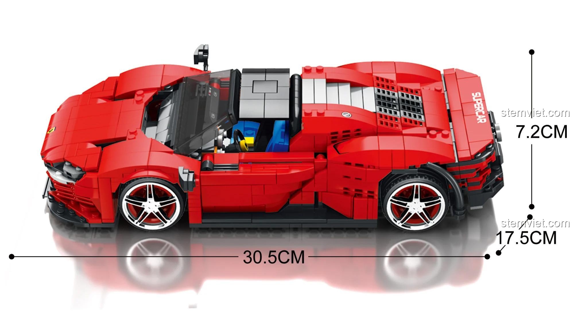 Bộ đồ chơi mô hình Ferrari Daytona SP3 11026 từ Reobrix là một minh chứng cho sự tỉ mỉ và tinh xảo trong thiết kế. Với màu đỏ chủ đạo rực rỡ, mô hình tái hiện chân thực từng đường nét khí động học của siêu xe thật. Tỉ lệ 1:16 ấn tượng giúp mô hình có kích thước vừa phải (Dài 30.6cm, Rộng 17.5cm, Cao 7.2cm), đủ lớn để trưng bày và đủ chi tiết để khám phá. Mỗi mảnh ghép của bộ lắp ghép Reobrix 11026 đều được chăm chút, đảm bảo độ chính xác cao, tạo nên một tổng thể hoàn hảo. Từ phần đầu xe hầm hố, thân xe mượt mà đến phần đuôi xe đầy uy lực, mọi chi tiết đều được tái hiện một cách sống động. Đặc biệt, mô hình còn có khả năng mở được cửa và mui xe, để lộ nội thất chi tiết bên trong, mang đến trải nghiệm chân thực như đang sở hữu một chiếc Ferrari Daytona SP3 thu nhỏ. Đây chắc chắn là một món đồ chơi mô hình Ferrari Daytona SP3 không thể thiếu trong bộ sưu tập của bất kỳ tín đồ siêu xe nào.