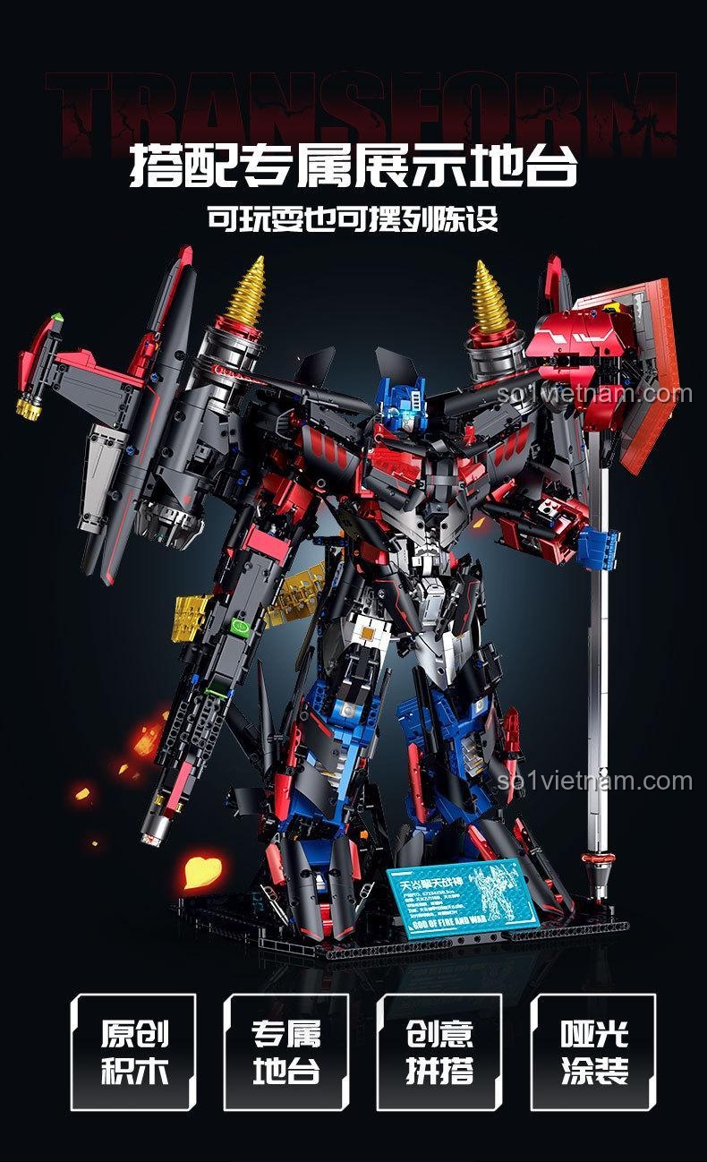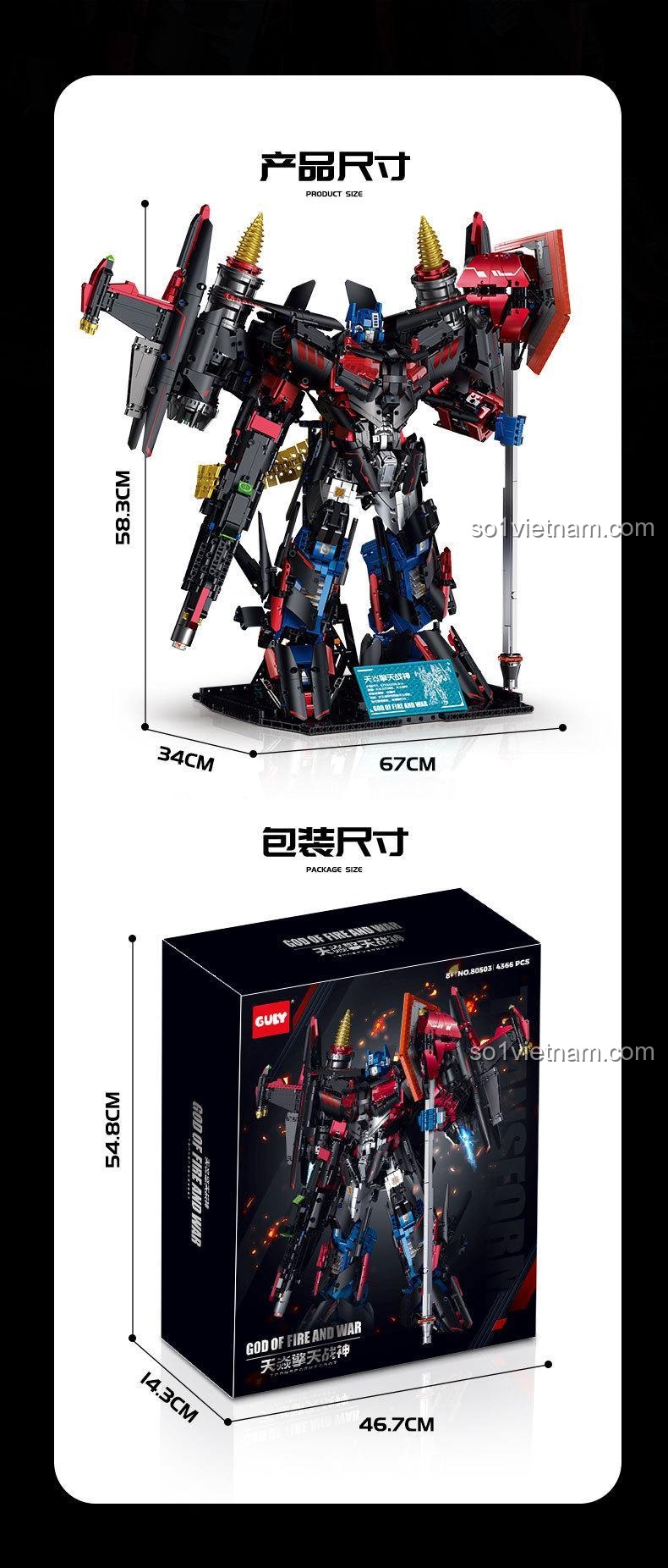 GULY 80503 Thiên Diễm Kình Thiên Chiến Thần sở hữu một thiết kế vô cùng ấn tượng và chi tiết. Với kích thước mô hình lên đến 67 x 34 x 58.3 cm, chiến thần này sẽ trở thành tâm điểm trong bộ sưu tập của bé. Các chi tiết được gia công tỉ mỉ, sắc nét, với màu sắc chủ đạo là đỏ, đen, xanh dương và vàng, tạo nên vẻ ngoài mạnh mẽ và đầy uy lực. Đặc biệt, bộ giáp trụ kim loại cao cấp cùng các chi tiết sơn ánh kim càng làm tăng thêm sự sang trọng và đẳng cấp cho robot. Khả năng biến hình linh hoạt giữa dạng robot và dạng máy bay chiến đấu, cùng với các khớp nối chuyển động mượt mà, cho phép bé thỏa sức sáng tạo với vô vàn tư thế hành động, tái hiện lại những trận chiến gay cấn.
