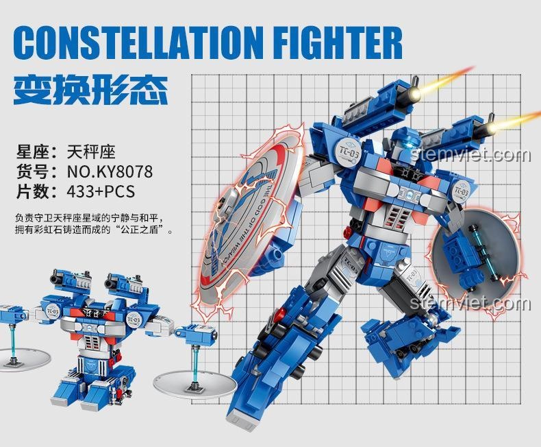 Robot Libra KY8078 thuộc dòng sản phẩm Constellation Fighter, lấy cảm hứng từ các chòm sao, mang đến một thiết kế mạnh mẽ và độc đáo. Bé có thể tự tay xây dựng nên một chiến binh robot hầm hố, sẵn sàng chiến đấu, hoặc biến đổi thành một dạng khác đầy ấn tượng, tạo nên những câu chuyện phiêu lưu bất tận.