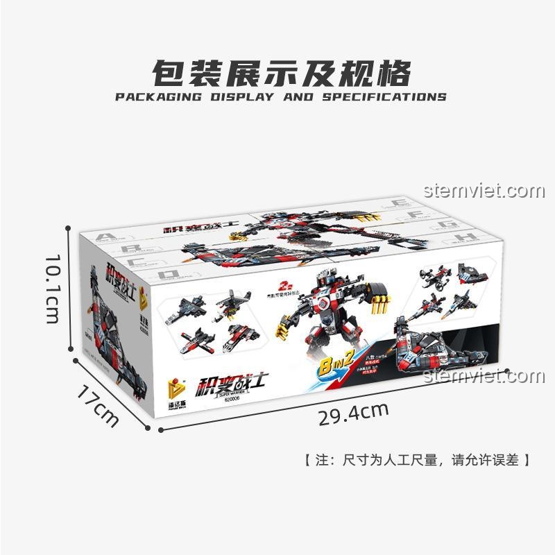 Bộ lắp ghép PanlosBrick 620006 Super Warrior cho phép bé lắp ráp thành 8 mẫu khác nhau, bao gồm các loại máy bay chiến đấu và robot biến hình.