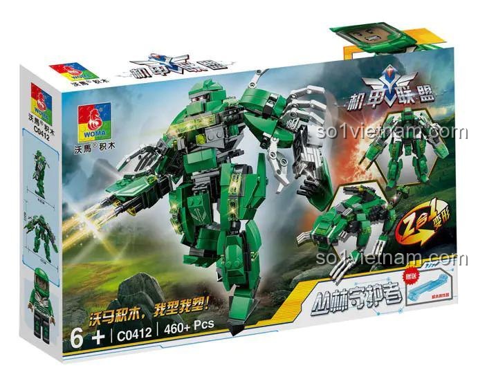 Bộ lắp ghép WOMA C0412 nổi bật với thiết kế robot cơ giáp màu xanh lá chủ đạo, mạnh mẽ và đầy uy lực. Từng chi tiết nhỏ đều được chăm chút tỉ mỉ, từ những khớp nối linh hoạt cho đến vũ khí trang bị, tất cả tạo nên một mô hình robot sống động và chân thực.