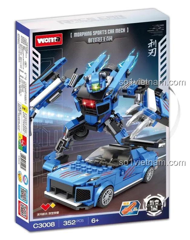 Bộ lắp ghép WOMA C3008 gây ấn tượng mạnh mẽ với thiết kế hai trong một độc đáo. Khi ở dạng xe đua, mô hình sở hữu kiểu dáng khí động học, màu xanh dương chủ đạo kết hợp các đường kẻ đỏ tạo cảm giác tốc độ và mạnh mẽ. Chiếc xe có các chi tiết tinh xảo như cánh gió sau, mâm xe thể thao, sẵn sàng chinh phục mọi đường đua.