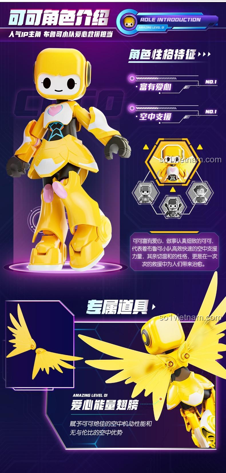 Robot “可可” không chỉ sở hữu vẻ ngoài đáng yêu với đôi cánh thiên thần lấp lánh, mà còn ẩn chứa một trái tim nhân hậu và tinh thần sẵn sàng giúp đỡ. Với chiều cao khoảng 12.5cm sau khi lắp ráp, mô hình này là sự kết hợp hoàn hảo giữa thiết kế độc đáo và câu chuyện ý nghĩa. Bé sẽ được hóa thân thành những người hùng, cùng “可可” thực hiện các nhiệm vụ giải cứu đầy thử thách, qua đó nuôi dưỡng lòng dũng cảm và tinh thần trách nhiệm.