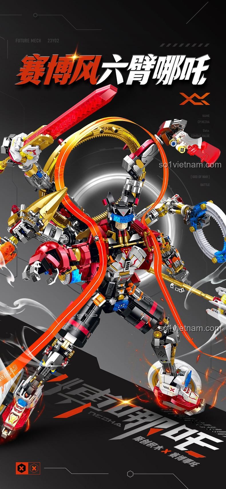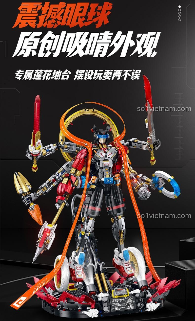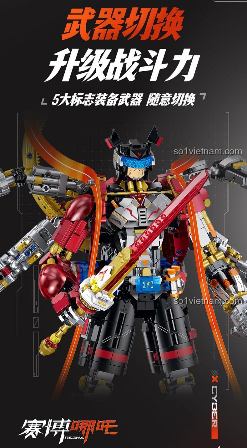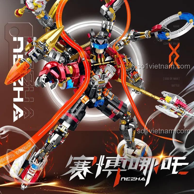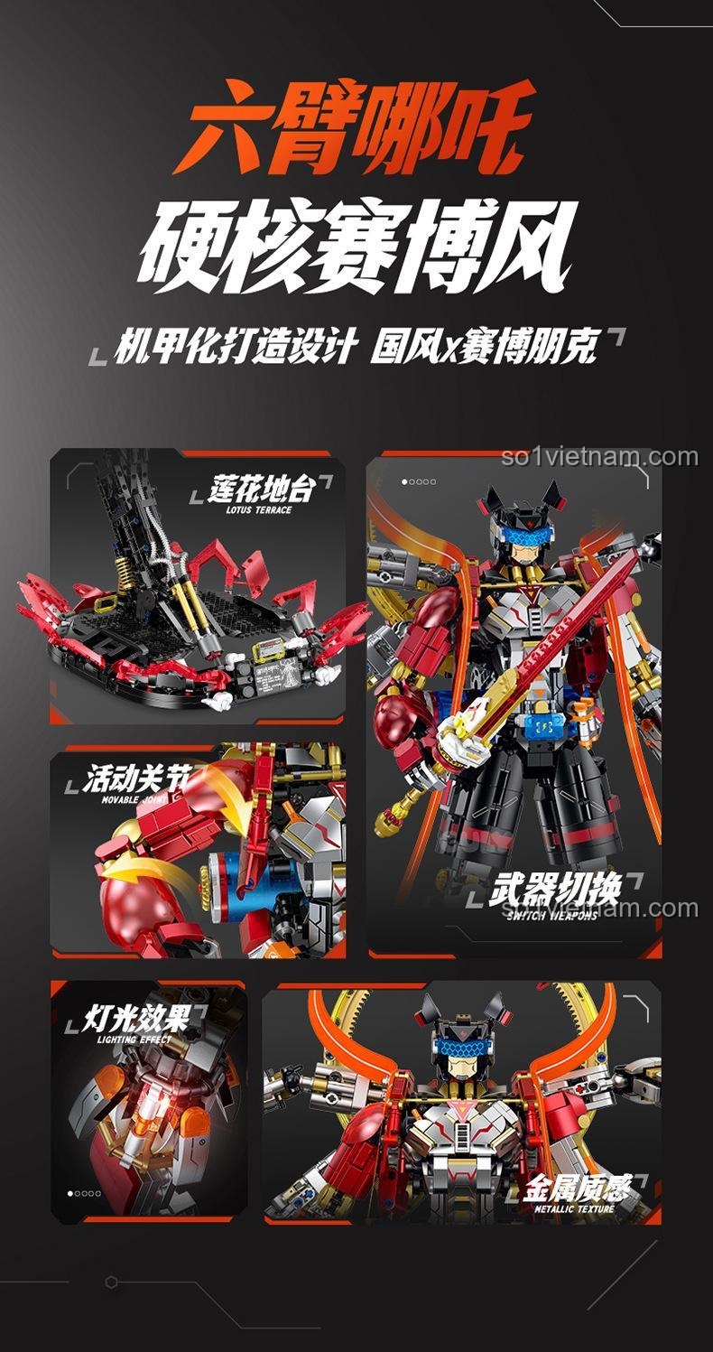 Robot Cyber Nezha GULY 80504 nổi bật với hiệu ứng đèn LED đa vị trí, 5 loại vũ khí có thể thay đổi linh hoạt, khớp nối cử động đa chiều và thiết kế sơn kim loại cao cấp. Bộ lắp ghép này mang đến trải nghiệm tương tác và trưng bày độc đáo.