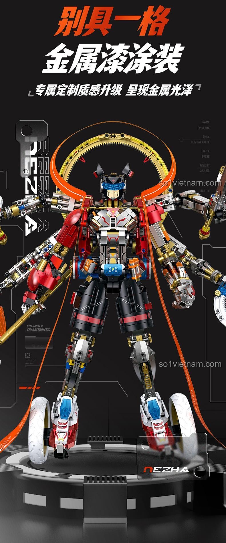 Mô hình được trang bị chân đế trưng bày hoành tráng, giúp Cyber Nezha có thể khoe trọn vẹn vẻ đẹp và sự uy dũng của mình. Các chi tiết nhỏ như bánh xe, cánh tay robot, và các bộ phận trên thân đều được chăm chút tỉ mỉ, thể hiện rõ sự đầu tư trong khâu thiết kế.