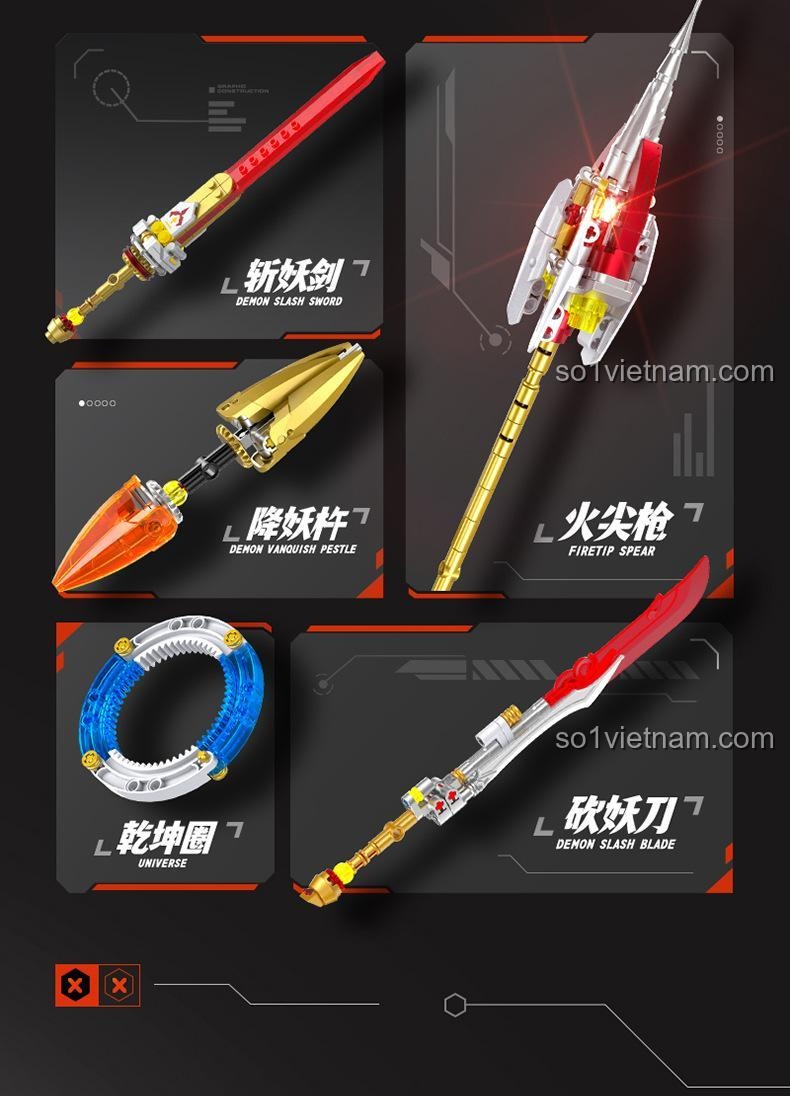 - Vũ khí đa dạng & có thể thay đổi: Bộ mô hình đi kèm với 5 loại vũ khí biểu tượng, cho phép bé thỏa sức thay đổi, tùy biến theo từng kịch bản chiến đấu. Từ thanh kiếm sắc bén đến ngọn giáo uy lực, Cyber Nezha luôn sẵn sàng cho mọi cuộc đối đầu.