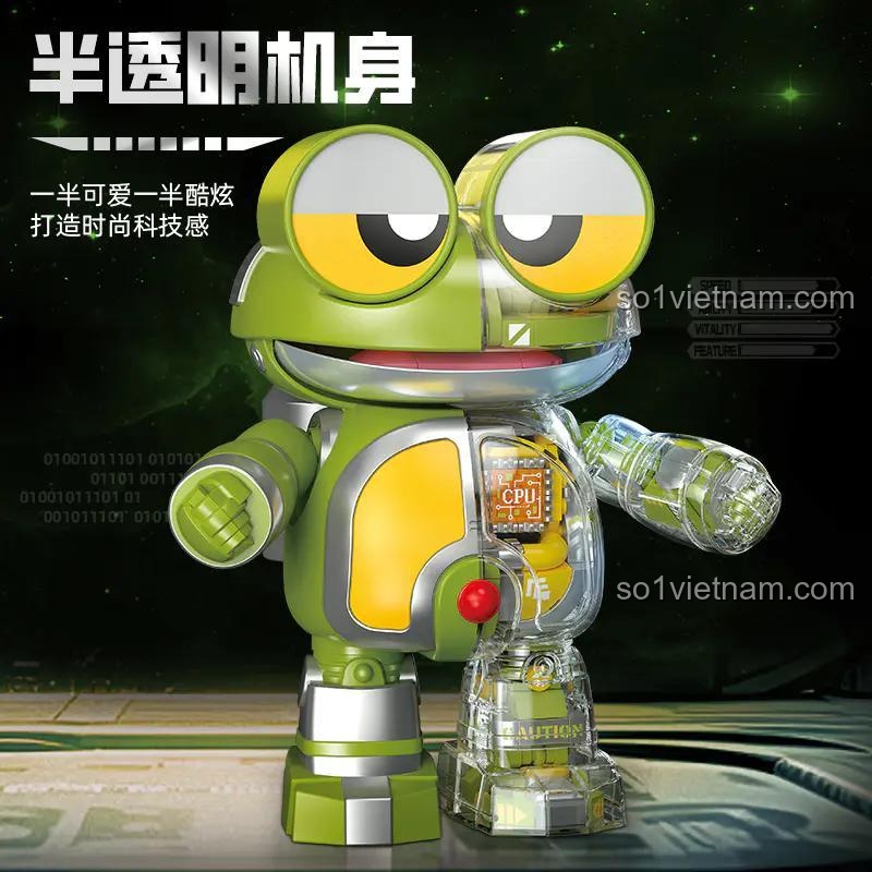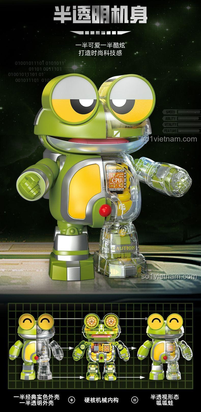Điểm nhấn ấn tượng nhất của Robot Ếch Gerotan B-ROBO 007 chính là thiết kế bán trong suốt độc đáo. Một nửa cơ thể robot được khoác lên mình lớp vỏ xanh lá cây và vàng tươi sáng, nửa còn lại để lộ cấu trúc máy móc bên trong với các chi tiết CPU, mạch điện tử tinh xảo. Sự kết hợp này tạo nên một vẻ ngoài vừa đáng yêu, vừa hiện đại, thu hút mọi ánh nhìn.
