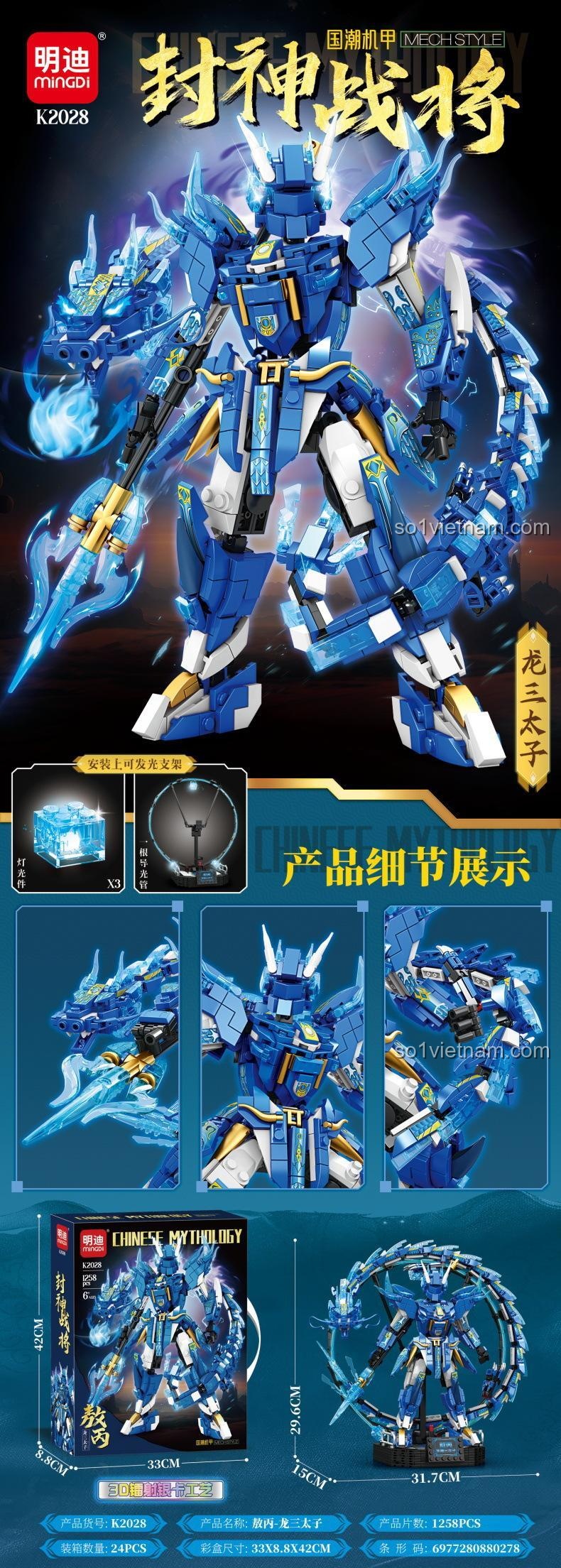 Lấy cảm hứng từ nhân vật Ngao Bính – Long Tam Thái Tử trong thần thoại Trung Hoa, bộ lắp ghép K2028 sở hữu một thiết kế vô cùng ấn tượng. Mô hình robot rồng xanh với các chi tiết tinh xảo, màu sắc chủ đạo là xanh dương, trắng và vàng, tạo nên vẻ ngoài mạnh mẽ và uy nghiêm. Đặc biệt, sản phẩm còn được trang bị hiệu ứng đèn LED lung linh, cùng với vòng xoáy rồng bao quanh, mang đến một hiệu ứng thị giác mãn nhãn, biến robot trở nên sống động hơn bao giờ hết.