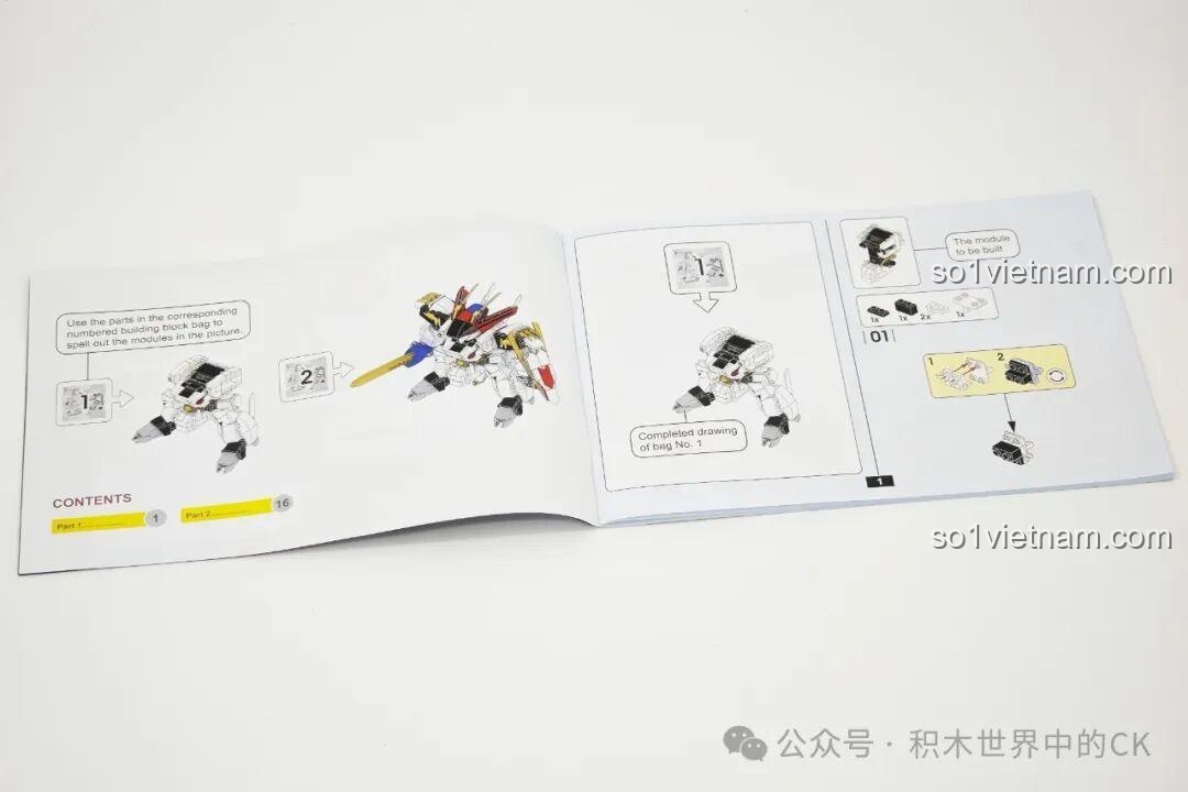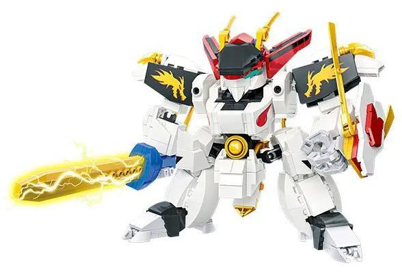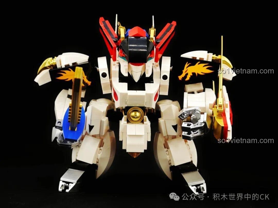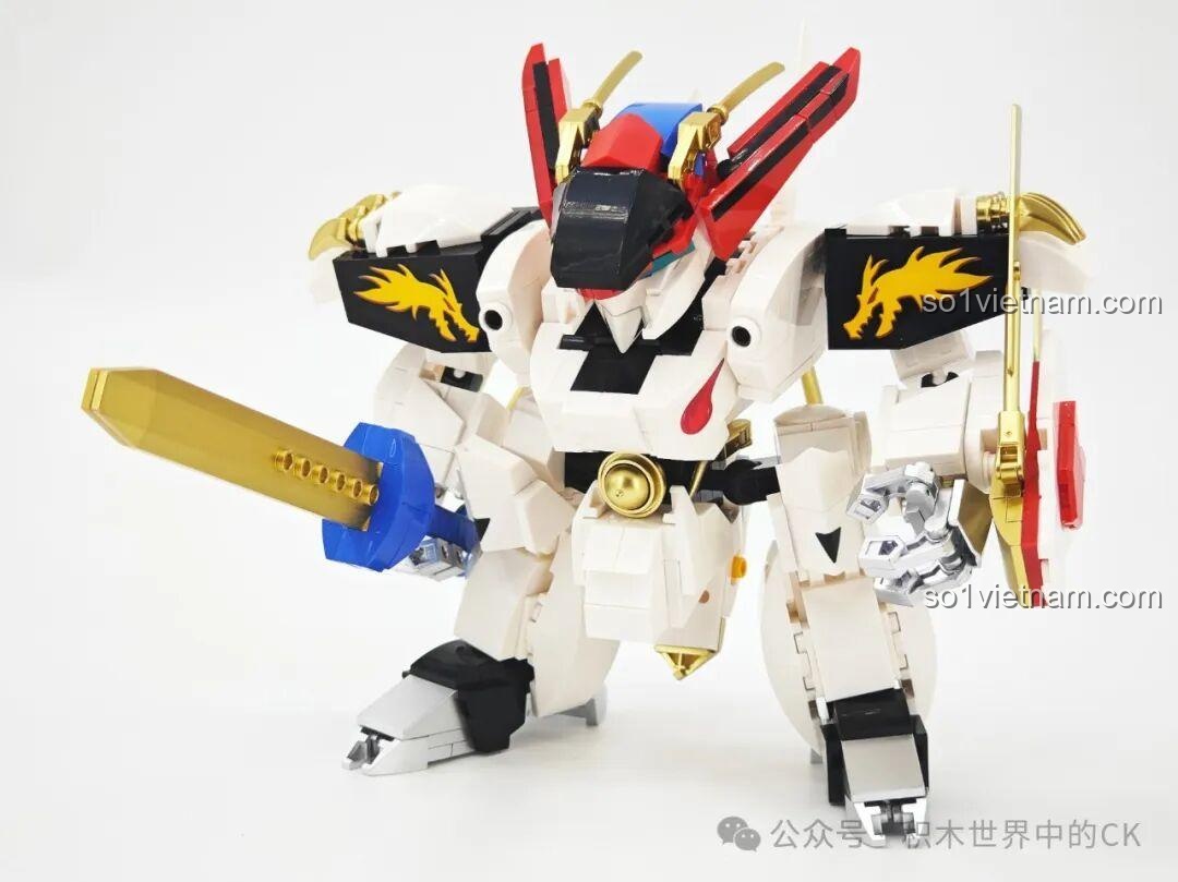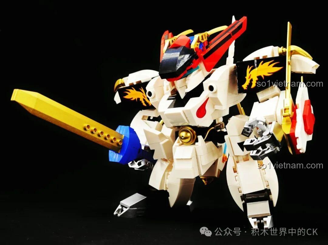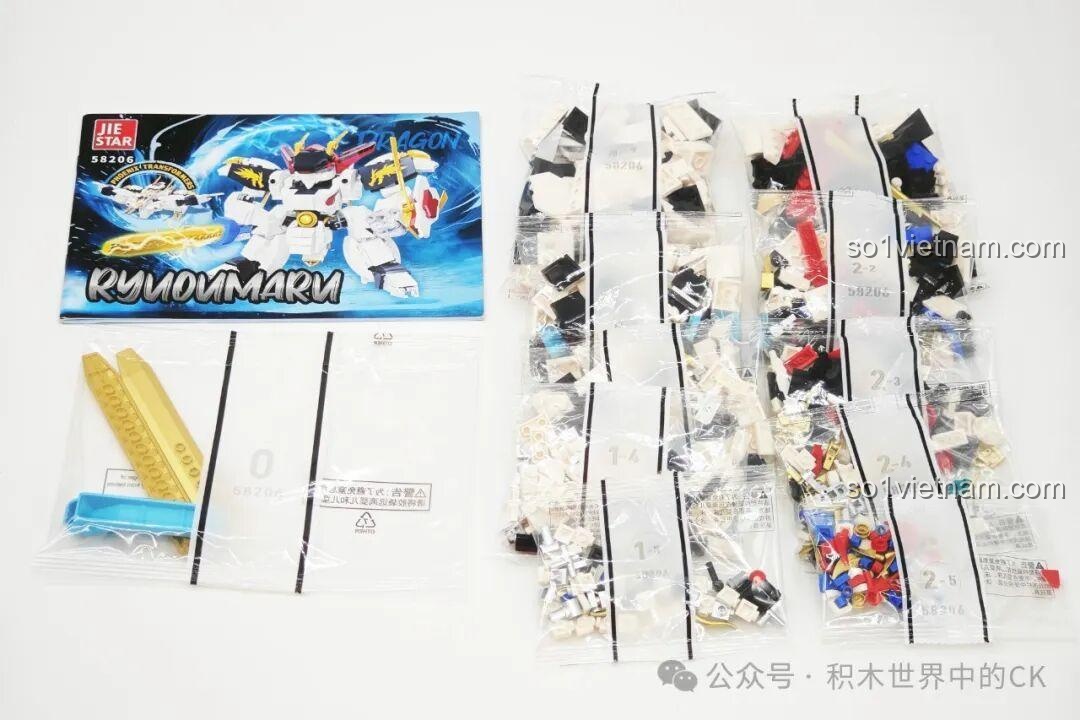 Bộ Lắp Ghép Robot Rồng Ryuomaru JIESTAR 58206 sở hữu thiết kế vô cùng ấn tượng và chi tiết. Mô hình chính là Robot Rồng Ryuomaru, với tông màu chủ đạo là trắng, vàng, đỏ và đen, tạo nên vẻ ngoài mạnh mẽ, oai vệ. Các chi tiết như đầu rồng, cánh tay robot, thanh kiếm vàng và chiếc khiên đỏ đều được tái hiện tỉ mỉ, mang đậm dấu ấn của nguyên tác.