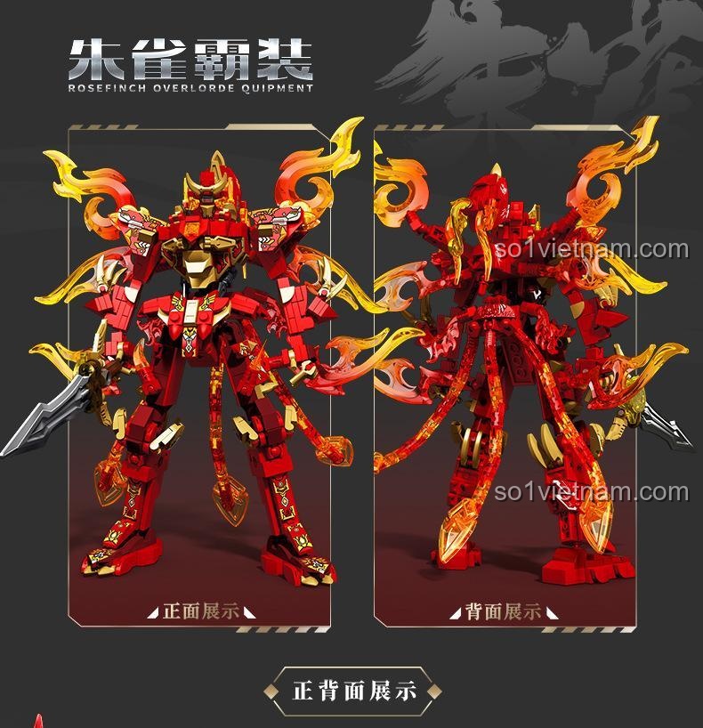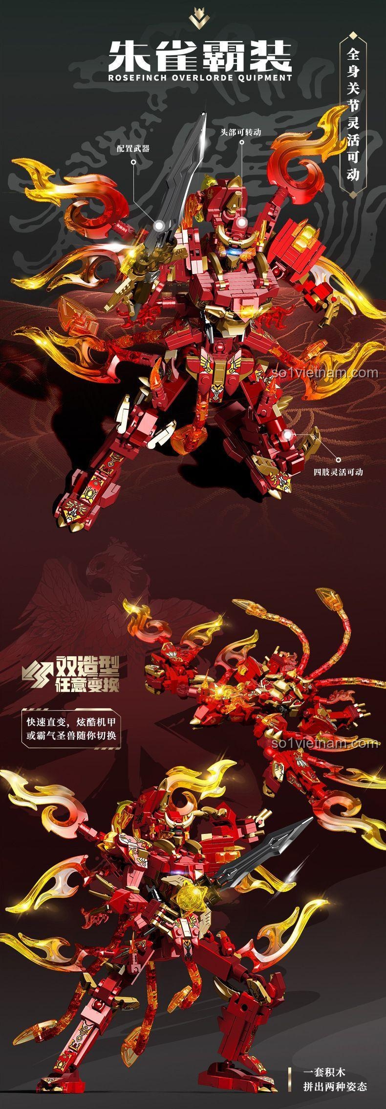 • Sử dụng các mảnh ghép từ bộ khác để tùy chỉnh giáp hoặc vũ khí cho Mecha Chu Tước, tạo nên một chiến binh độc nhất vô nhị.