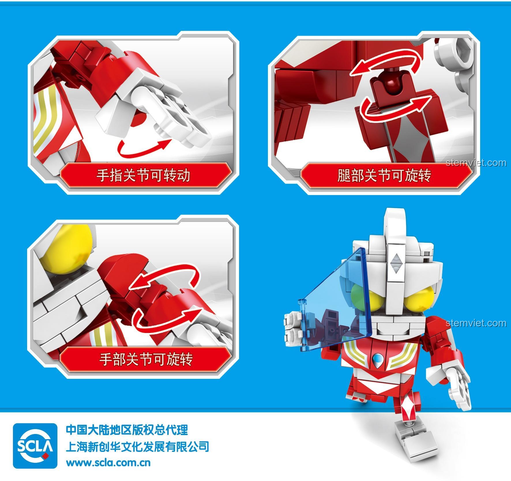 Điểm nhấn đặc biệt của bộ xếp hình Ultraman mạnh mẽ này chính là khả năng khớp cử động linh hoạt. Bé có thể dễ dàng xoay chuyển đầu, tay, chân và thậm chí cả các ngón tay của Ultraman, giúp tạo ra vô số tư thế chiến đấu và hành động anh hùng. Điều này không chỉ tăng thêm tính tương tác mà còn kích thích sự sáng tạo của bé trong việc kể chuyện và nhập vai. Dù không có kích thước mô hình cụ thể, nhưng với thiết kế dạng khối BrickHeadz, mô hình Ultraman dạng khối này vẫn đủ ấn tượng để trở thành trung tâm của mọi bộ sưu tập.