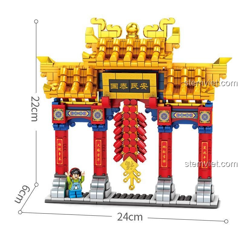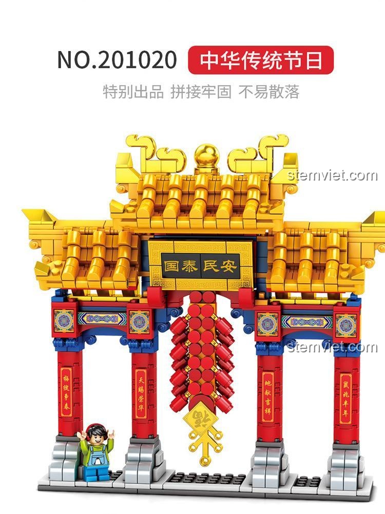 Bên cạnh đó, mô hình Cổng Chào Tết Nguyên Đán cũng được thiết kế với các chi tiết có thể tương tác, như những dây pháo đỏ rực rỡ, tạo nên một không gian lễ hội sống động. Các minifigure đi kèm, từ ông già, cậu bé đến các vũ công múa lân, đều có khớp nối linh hoạt, giúp bé dễ dàng thay đổi tư thế, tạo ra các câu chuyện và tình huống chơi đa dạng. Sự kết hợp giữa mô hình kiến trúc và các nhân vật sống động biến bộ đồ chơi xây dựng Cổng Chào Tết 1020 thành một sân khấu thu nhỏ, nơi bé có thể tự do thể hiện trí tưởng tượng phong phú của mình. Đây là một món đồ chơi tuyệt vời để bé khám phá, sáng tạo và tận hưởng niềm vui bất tận.