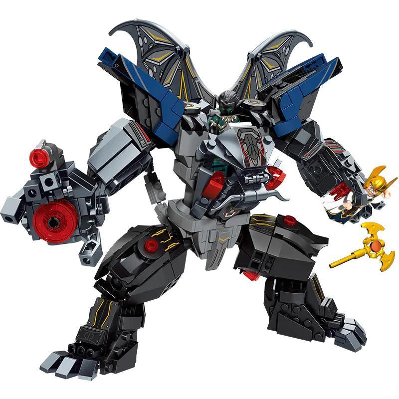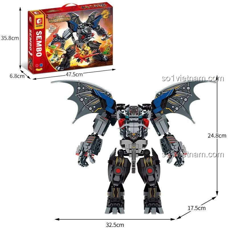 Ngay từ cái nhìn đầu tiên, bộ xếp hình Giáp Chiến Long Đá Đen SEMBO 206037 đã gây ấn tượng mạnh mẽ với thiết kế vô cùng tinh xảo và mạnh mẽ. Lấy cảm hứng từ hình tượng rồng và robot chiến đấu, mô hình này là sự kết hợp hoàn hảo giữa vẻ đẹp hùng vĩ của loài rồng và sự hiện đại của công nghệ. Màu sắc chủ đạo là đen và xám, tạo nên vẻ ngoài bí ẩn và uy lực, điểm xuyết thêm các chi tiết xanh dương và đỏ rực rỡ, làm nổi bật các khớp nối và vũ khí.