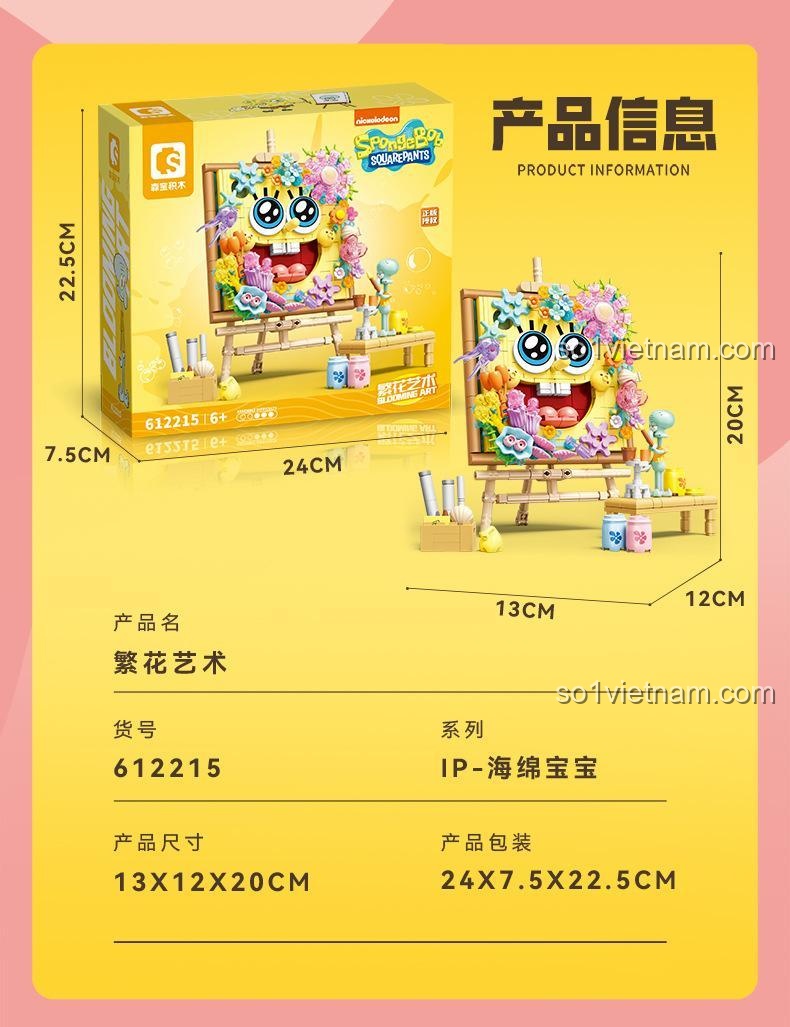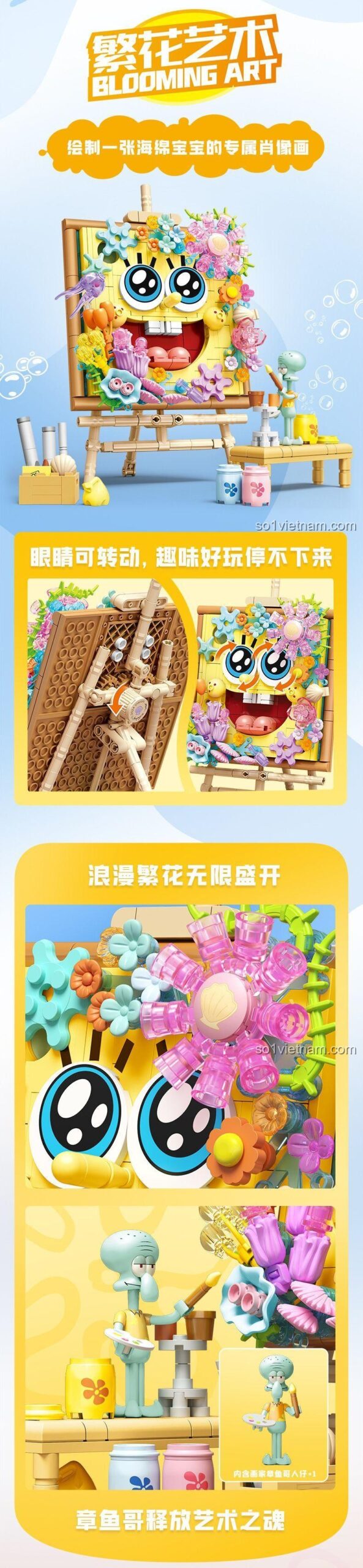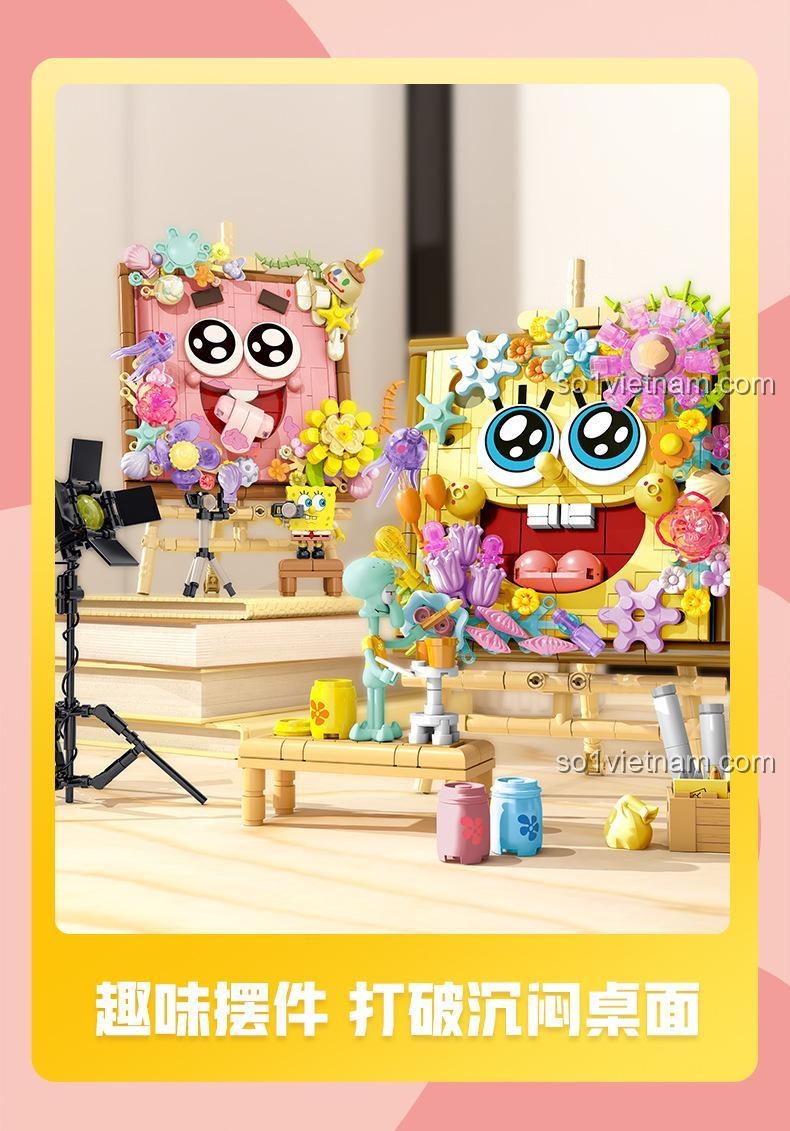 Bộ lắp ghép SEMBO 612215 tái hiện một cách sinh động hình ảnh SpongeBob SquarePants đang say sưa sáng tạo nghệ thuật bên giá vẽ và bức tranh hoa rực rỡ. Điểm nhấn đặc biệt của mô hình chính là đôi mắt của SpongeBob có thể xoay, mang đến sự tương tác và thích thú cho người chơi. Từng chi tiết nhỏ, từ những bông hoa đủ màu sắc, những chiếc bánh cupcake xinh xắn đến chú Hải Ngư Tinh Anh đang chăm chú vẽ, tất cả đều được thiết kế tinh xảo, tạo nên một tác phẩm nghệ thuật 3D sống động và đầy cuốn hút.