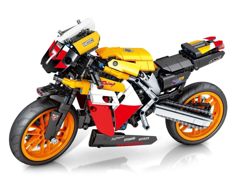 Ngay từ cái nhìn đầu tiên, bộ đồ chơi lắp ráp Mô tô phân khối lớn SEMBO 701718 đã gây ấn tượng mạnh với thiết kế cực kỳ bắt mắt và hiện đại. Chiếc mô tô nổi bật với sự kết hợp hài hòa của các màu sắc chủ đạo như cam rực rỡ, đen mạnh mẽ, vàng năng động, đỏ cá tính và trắng tinh tế. Sự phối màu này không chỉ tạo nên vẻ ngoài thể thao, cuốn hút mà còn giúp bé dễ dàng nhận diện và phân biệt các bộ phận trong quá trình lắp ráp.