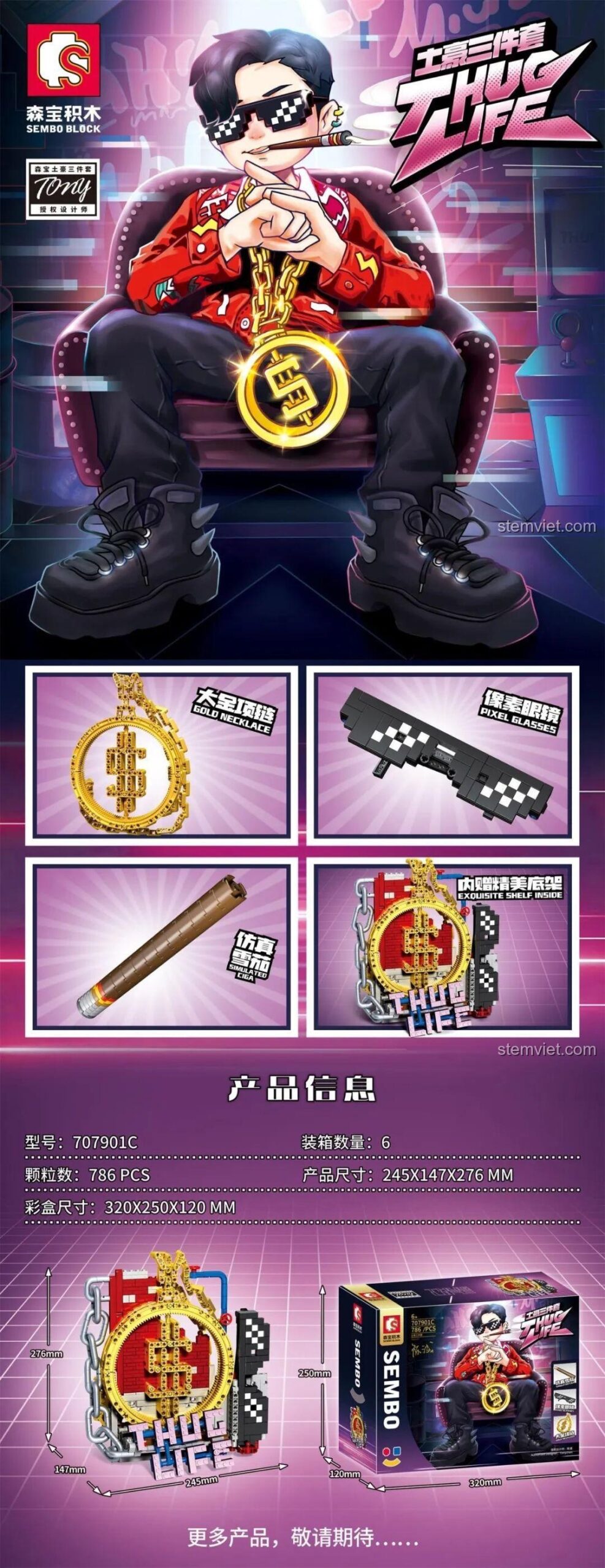 Bộ lắp ghép Sembo 707901C Bộ 3 Thug Life: Dây Chuyền Vàng, Kính Pixel, Xì Gà (786 mảnh ghép) – Phong Cách Đường Phố và Dây Chuyền Vàng Xoay