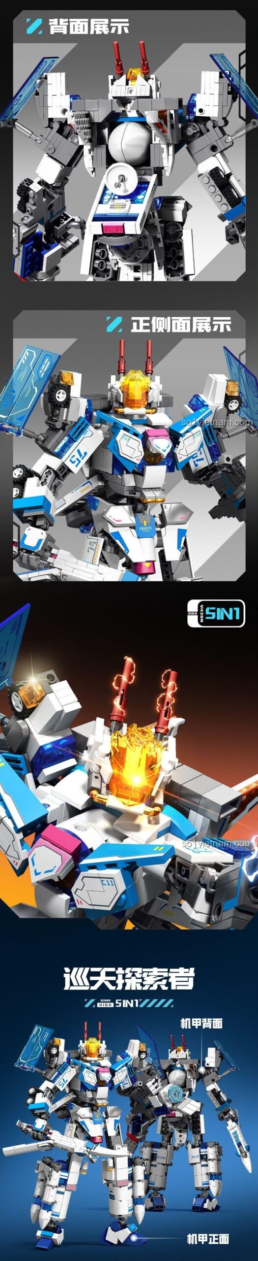 Người Khám Phá Bầu Trời Sembo Block 203376 gây ấn tượng mạnh mẽ ngay từ cái nhìn đầu tiên với thiết kế hiện đại, mạnh mẽ và đầy tính tương lai. Mô hình robot cơ giáp này được phối màu chủ đạo là Trắng và Xanh dương, điểm xuyết thêm các chi tiết Xám và Cam, tạo nên vẻ ngoài năng động và sẵn sàng cho mọi cuộc chiến. Với kích thước ấn tượng 23cm (dài) x 14cm (rộng) x 29cm (cao) sau khi lắp ráp, Người Khám Phá Bầu Trời Sembo Block 203376 sẽ trở thành tâm điểm trong bộ sưu tập đồ chơi của bé. Từng mảnh ghép được thiết kế tỉ mỉ, tái hiện chân thực các khớp nối linh hoạt, hệ thống vũ khí và giáp trụ của một robot thám hiểm vũ trụ. Đặc biệt, các chi tiết đèn LED tích hợp sẽ làm mô hình trở nên sống động hơn, tạo hiệu ứng ánh sáng ấn tượng khi bé chơi. Bé trai 6 tuổi của bạn sẽ mê mẩn với vẻ ngoài ngầu lòi và khả năng biến hình đa dạng của bộ đồ chơi mô hình Sembo Block 203376 này.