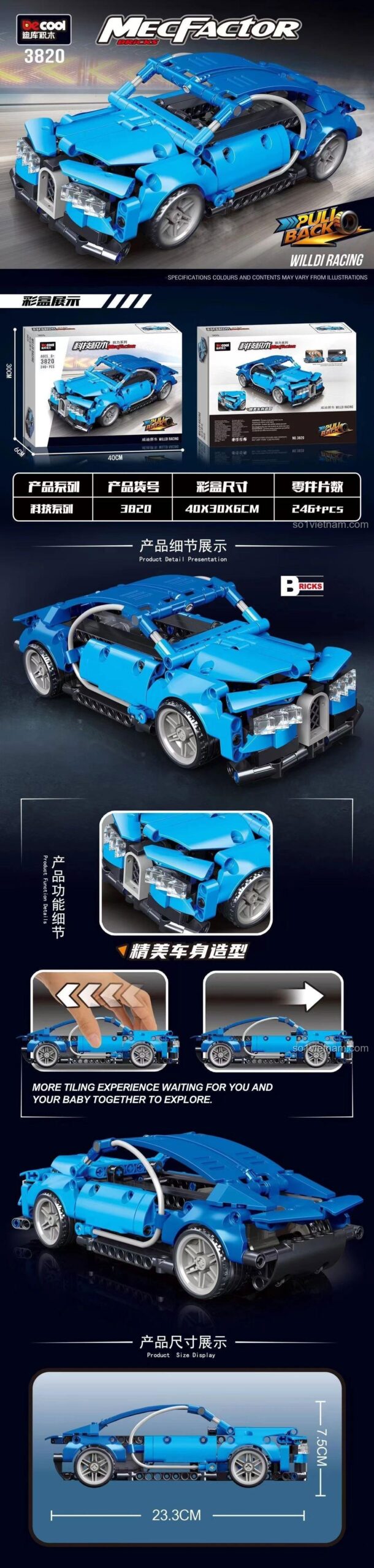 Bộ lắp ghép Bugatti Chiron 3820 gây ấn tượng mạnh mẽ với thiết kế mô phỏng tỉ lệ 1:16 (ước tính) của siêu xe Bugatti Chiron thực tế. Với 246 chi tiết nhựa ABS cao cấp, bộ đồ chơi này tái hiện hoàn hảo những đường nét khí động học đặc trưng, từ phần đầu xe hầm hố với lưới tản nhiệt hình móng ngựa đặc trưng, cụm đèn pha LED sắc sảo, đến thân xe vuốt dài đầy quyến rũ và cánh gió sau thể thao. Màu xanh dương chủ đạo, kết hợp với các chi tiết màu trắng và đen, tạo nên vẻ ngoài sang trọng và mạnh mẽ, đúng như tinh thần của Bugatti. Kích thước mô hình sau khi hoàn thiện (23.3 x 7.5 x 7.5 cm) vừa vặn để trưng bày trên bàn học, kệ sách, hoặc mang đi chơi. Từng mảnh ghép được chế tác chính xác, đảm bảo độ khít cao, mang lại trải nghiệm lắp ráp mượt mà và hài lòng.