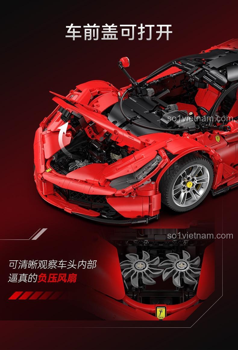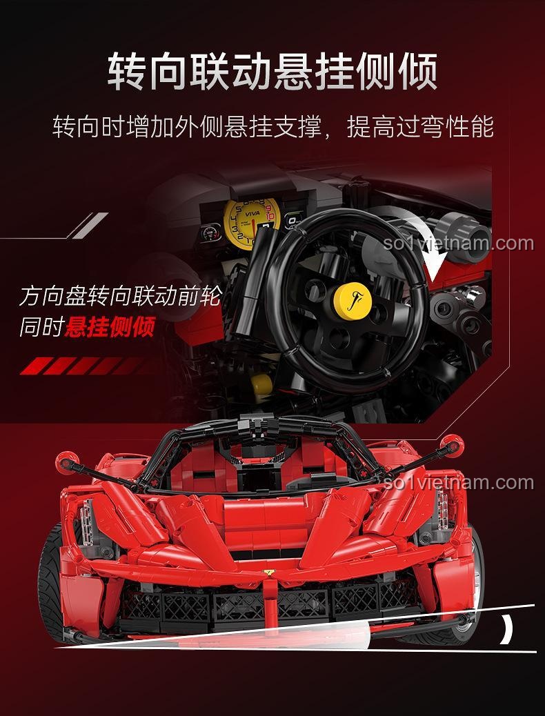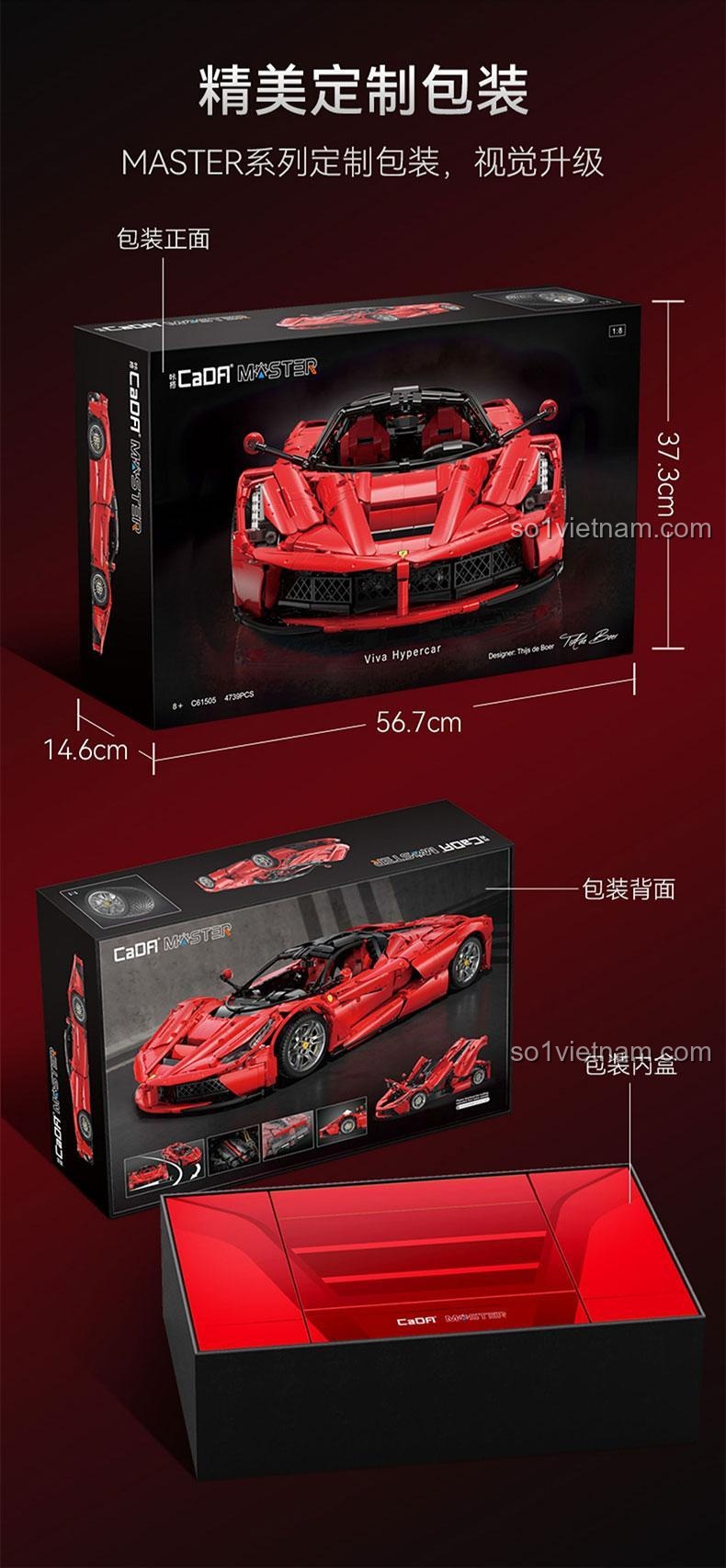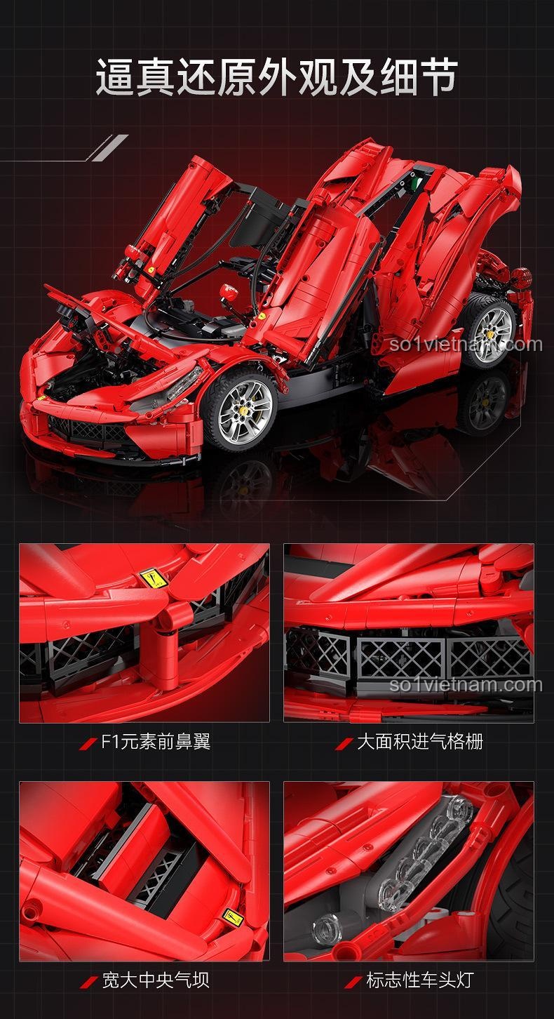 Bộ lắp ghép Ferrari Laferrari C61505 của CaDA nổi bật với động cơ V12 chi tiết, hộp số 4 cấp có thể chuyển đổi, hệ thống lái kết nối với vô lăng, hệ thống treo trước có thể điều chỉnh độ cao, cửa cánh bướm mở ấn tượng, cánh gió sau nâng hạ và nắp capo, cốp sau mở được.