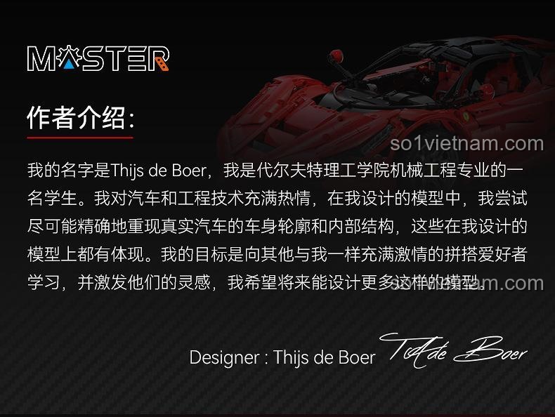 “Tên tôi là Thijs de Boer, tôi là sinh viên ngành Kỹ thuật Cơ khí tại Đại học Kỹ thuật Delft. Tôi có niềm đam mê mãnh liệt với ô tô và công nghệ kỹ thuật. Trong các thiết kế mô hình của mình, tôi luôn cố gắng tái hiện chính xác nhất các chi tiết về khung gầm và nội thất của xe thật. Mục tiêu của tôi là học hỏi từ những người cùng đam mê và khơi dậy nguồn cảm hứng cho họ, hy vọng sẽ thiết kế được nhiều mô hình đa dạng hơn nữa trong tương lai.”