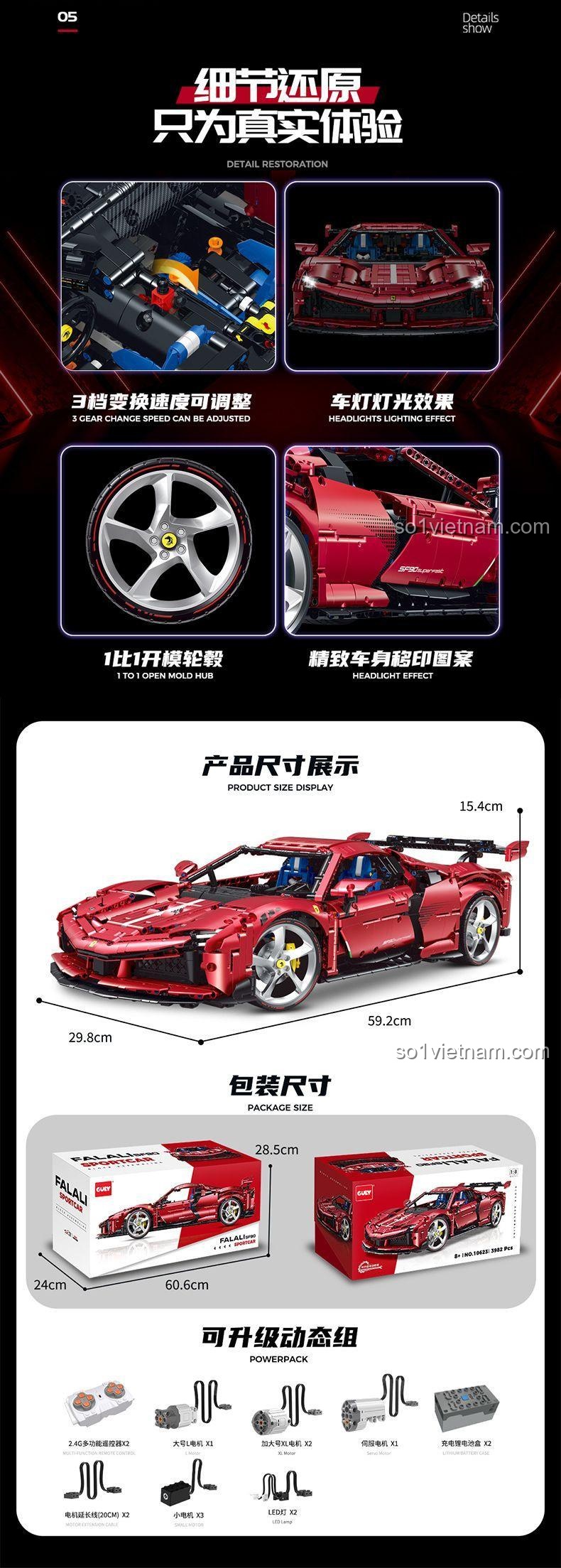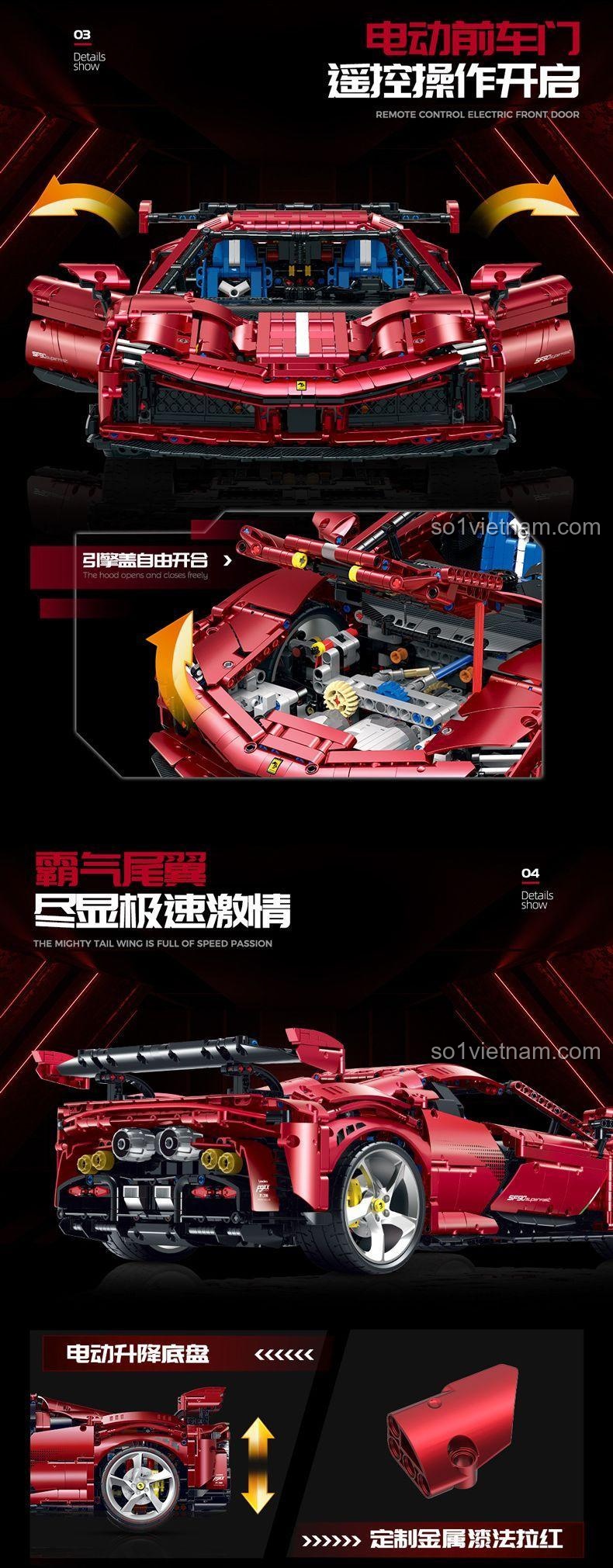 Bộ Lắp Ghép Siêu Xe Ferrari SF90 XX GULY 10623 không chỉ dừng lại ở vẻ ngoài ấn tượng, mà còn mang đến những tính năng tương tác sống động, biến nó thành một món đồ chơi độc đáo và hấp dẫn: