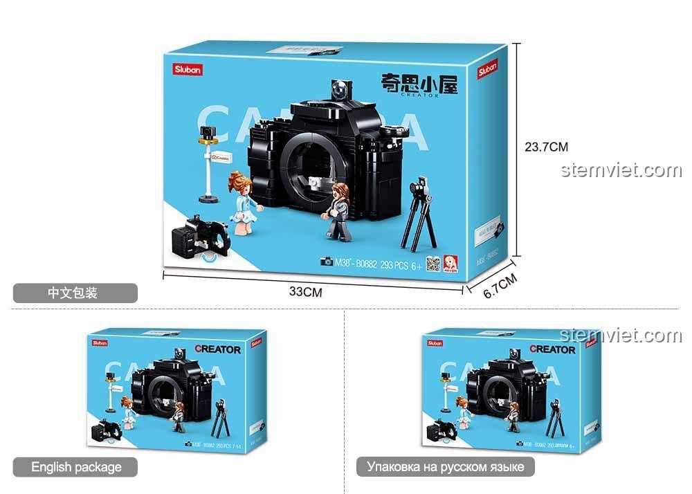 Bộ đồ chơi mô hình Cửa hàng máy ảnh Sluban M38-B0882 nổi bật với thiết kế sáng tạo, biến một chiếc máy ảnh thông thường thành một cửa hàng thu nhỏ đầy đủ tiện nghi. Mô hình máy ảnh này có màu sắc chủ đạo là đen, xanh dương và trắng, tạo nên vẻ ngoài hiện đại và bắt mắt. Với chiều dài mô hình 13.4 cm, chiều rộng 12 cm và chiều cao 9 cm, đây là một kích thước vừa phải, dễ dàng trưng bày trên bàn học hay kệ sách của bé.