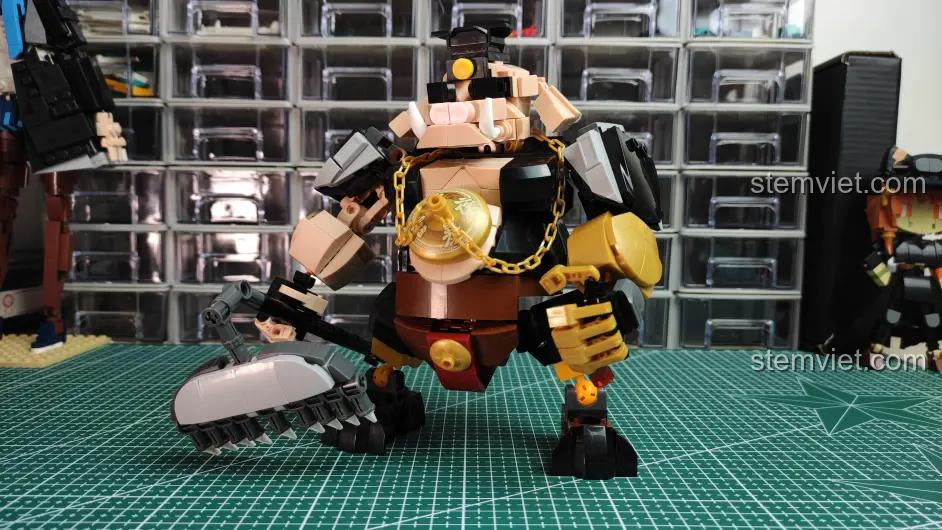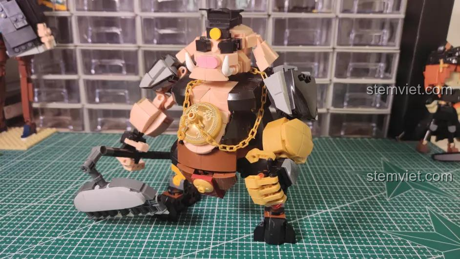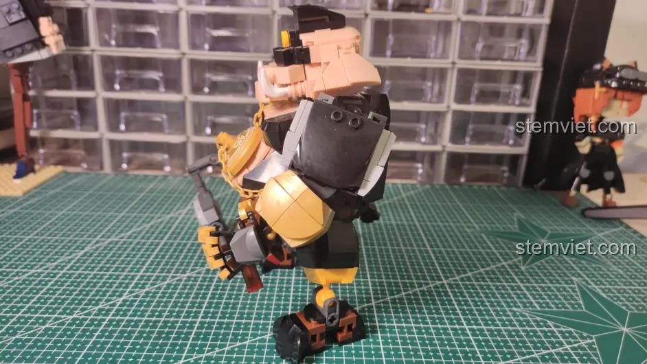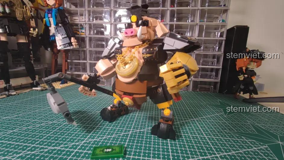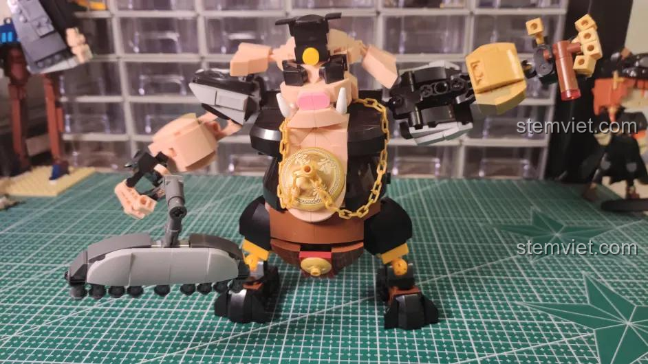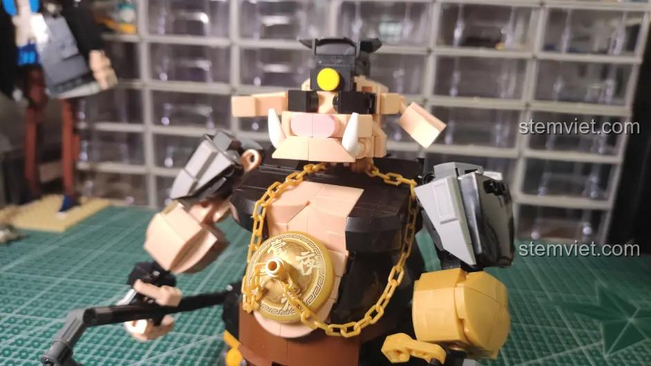 Mô hình Trư Cương Liệt Sluban M38-B1009 thực sự là một tuyệt tác thiết kế, nổi bật với vẻ ngoài mạnh mẽ, hiện đại và đầy cá tính. Với chiều dài 18.6 cm, chiều rộng 12.6 cm và chiều cao 17.5 cm, mô hình này có kích thước ấn tượng, đủ lớn để trưng bày và đủ nhỏ để bé trai 6 tuổi dễ dàng cầm nắm, tương tác. Màu sắc chủ đạo của mô hình là sự kết hợp hài hòa giữa đen, nâu, vàng, kem và xám, tạo nên một tổng thể sang trọng và mạnh mẽ. Phần thân chính màu đen và nâu làm nổi bật các chi tiết màu vàng kim loại và màu kem của da Trư Bát Giới, mang đến một diện mạo hoàn toàn mới lạ.