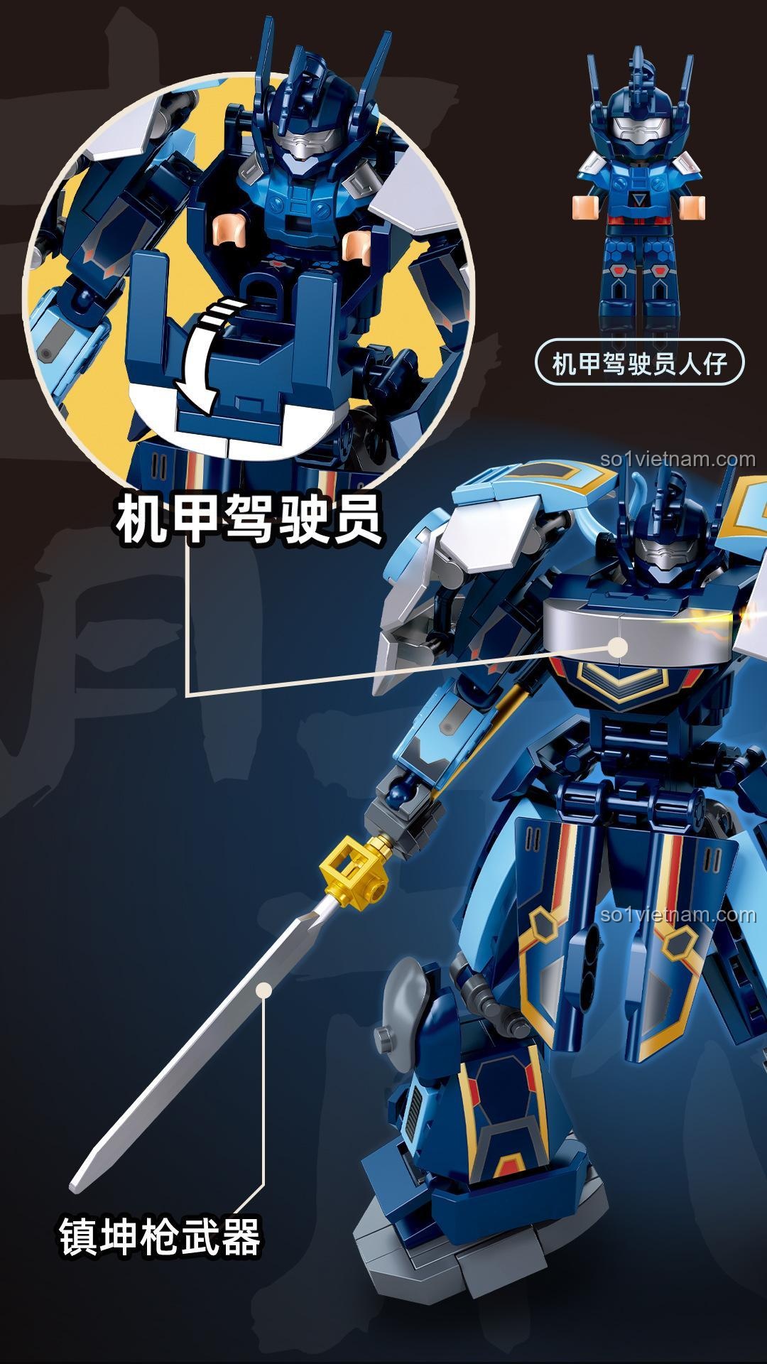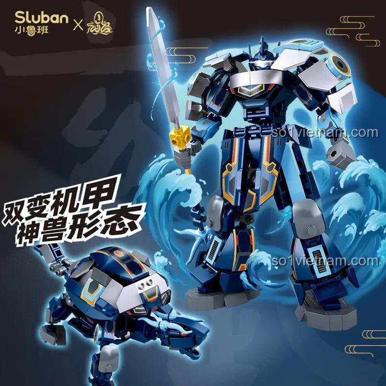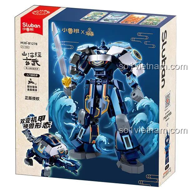 Bộ lắp ghép Sluban M38-B1278 Cơ giáp Huyền Vũ gây ấn tượng mạnh mẽ với thiết kế Song Biến Thần Thú độc đáo. Mô hình có thể biến đổi linh hoạt giữa hai hình thái: một dạng cơ giáp chiến đấu hùng dũng và một dạng thần thú Huyền Vũ uy nghi. Với màu sắc chủ đạo là xanh dương đậm, kết hợp hài hòa với các chi tiết xám, trắng và điểm nhấn cam, mô hình toát lên vẻ mạnh mẽ, hiện đại nhưng vẫn giữ được nét cổ điển của linh vật Huyền Vũ.