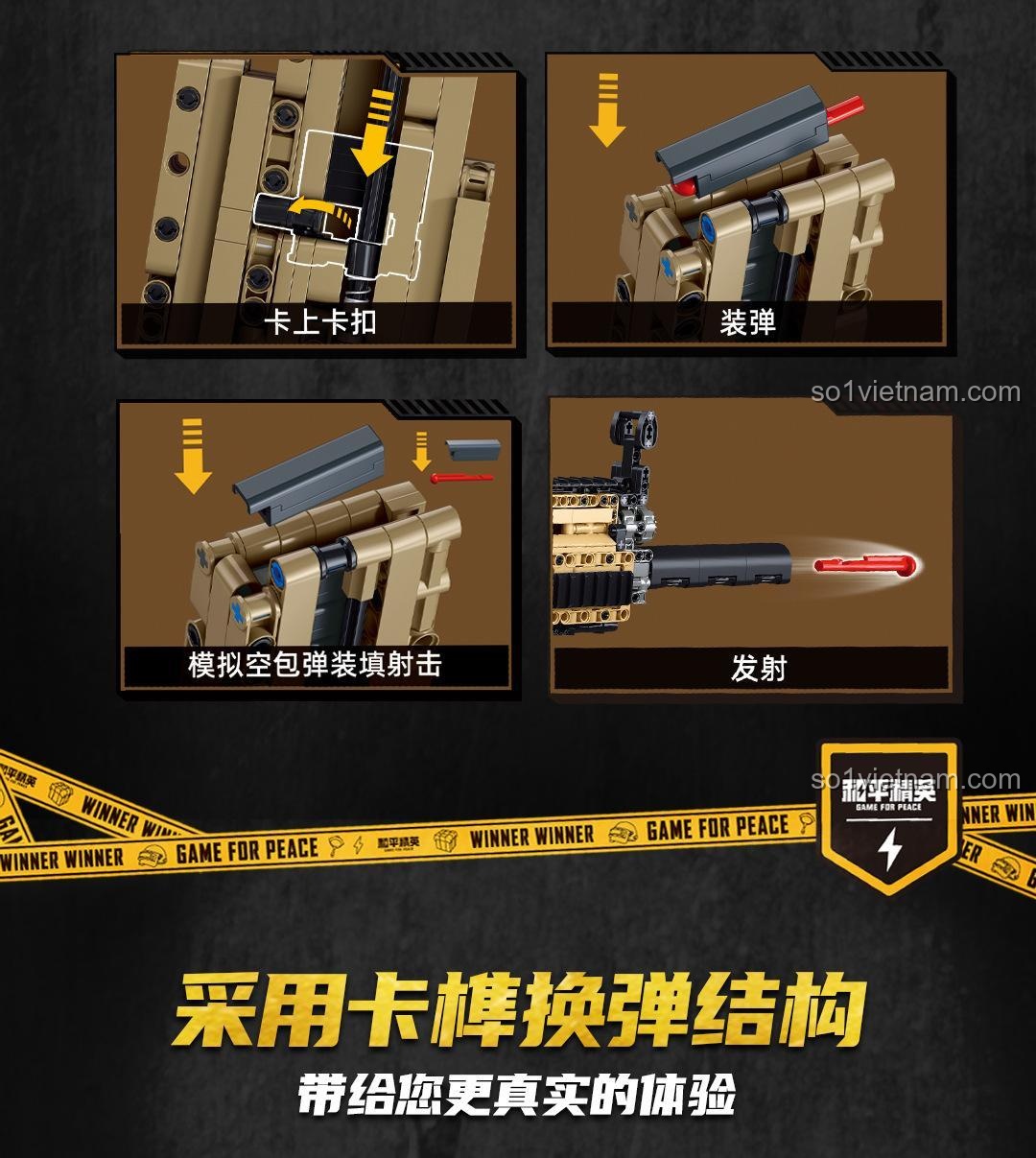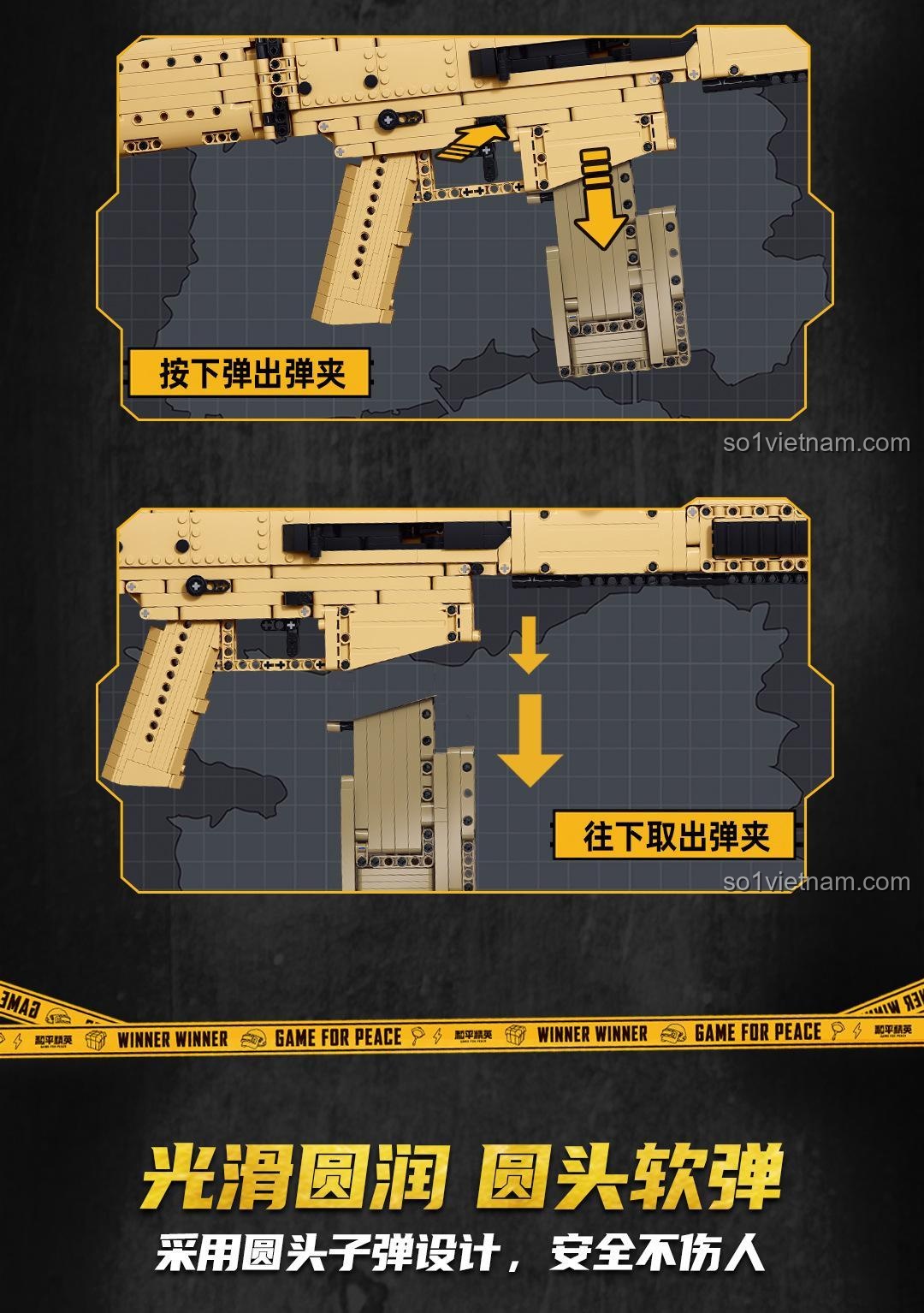 Ngoài ra, bộ đồ chơi lắp ráp này còn có tính năng tự động nạp đạn và mô phỏng nạp đạn rỗng, cùng với cơ chế thay đạn bằng băng đạn, giúp tăng cường tính chân thực và tương tác. Các chi tiết như cò súng, báng súng đều có thể cử động linh hoạt, mang lại cảm giác như đang thao tác với một khẩu súng thật. Đạn xốp được thiết kế đầu tròn mềm mại, đảm bảo an toàn tuyệt đối khi chơi. Với bộ lắp ghép Súng SCAR-L Game for Peace này, con trai 14 tuổi của bạn sẽ có những giờ phút giải trí đầy kịch tính và sáng tạo.
