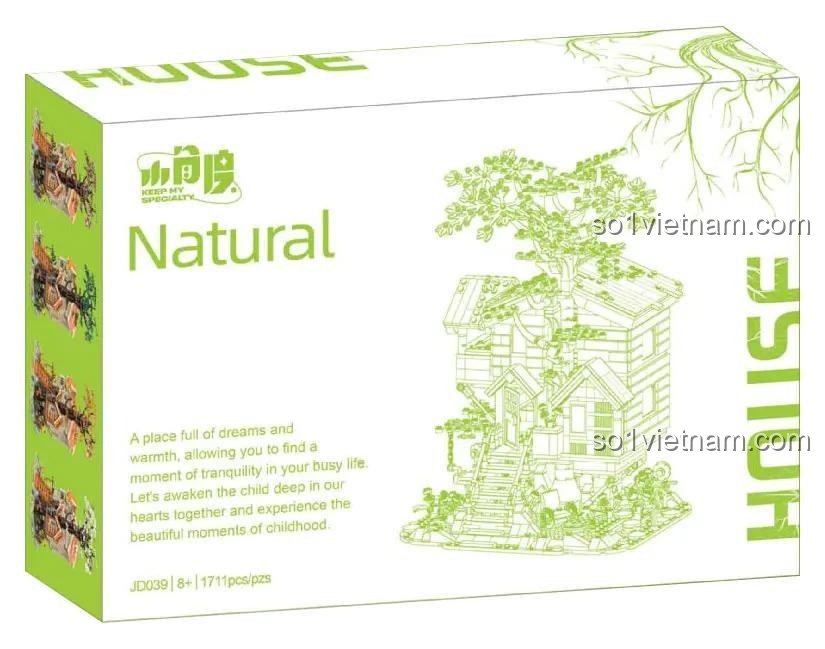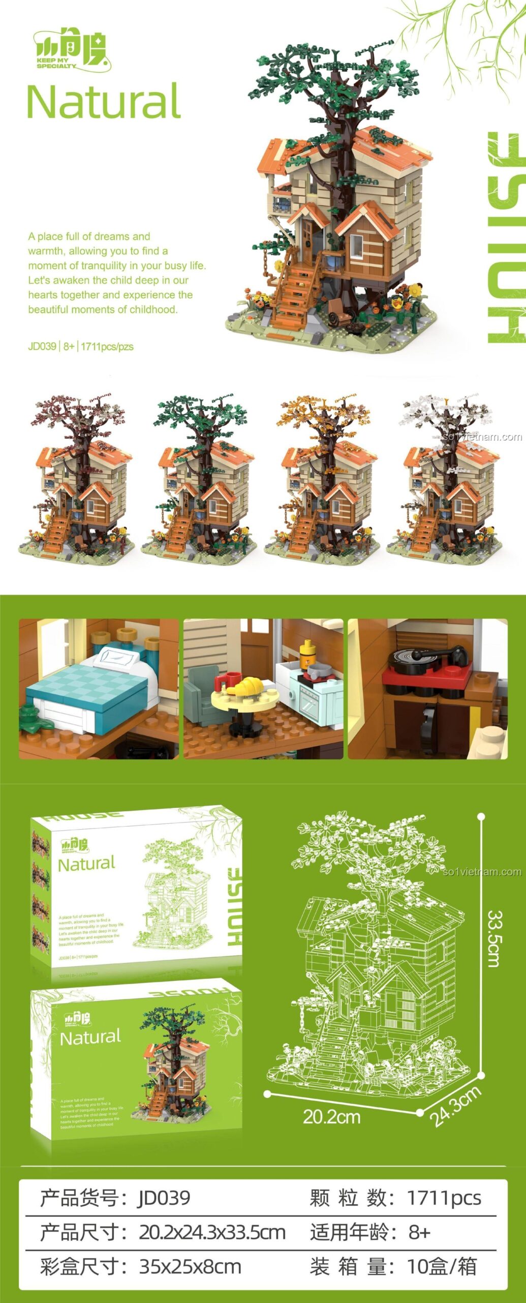 Mô hình Nhà Cây Small Angle JD039 là một minh chứng cho sự tinh xảo trong thiết kế và sự tỉ mỉ trong từng chi tiết. Với 1711 mảnh ghép, mô hình tái hiện một ngôi nhà cây đầy đủ tiện nghi, ẩn mình giữa tán lá xanh tươi. Màu sắc chủ đạo như Nâu của thân cây vững chãi, Xanh lá của những tán lá sum suê, Cam rực rỡ của mái nhà và cầu thang, cùng tông Kem ấm áp của tường nhà, tất cả hòa quyện tạo nên một bức tranh thiên nhiên sống động. Mô hình có kích thước ấn tượng với chiều dài 24.3 cm, chiều rộng 20.2 cm và chiều cao 33.5 cm, đủ lớn để bé có thể chiêm ngưỡng và tương tác. Từng chi tiết nhỏ như bậc thang dẫn lên nhà, cửa sổ, ban công, và đặc biệt là những tán lá được thiết kế khéo léo, mang đến cảm giác chân thực như một ngôi nhà cây thực thụ. Đây là một bộ xếp hình JD039 không chỉ đẹp mắt mà còn kích thích khả năng quan sát và cảm nhận thẩm mỹ của bé.