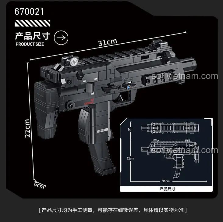 Bộ lắp ghép Panlos 670021 nổi bật với thiết kế mô phỏng chân thực súng tiểu liên MP7, mang đến một mô hình có kích thước ấn tượng: dài 31cm, cao 22cm và rộng 6cm. Từng chi tiết nhỏ nhất, từ báng súng, tay cầm, đến nòng súng và băng đạn, đều được tái hiện một cách tỉ mỉ, sắc nét, tạo nên một sản phẩm hoàn chỉnh đầy cuốn hút.