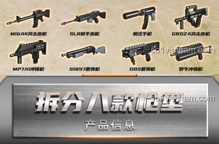 Điểm đặc biệt nhất của bộ sản phẩm này là khả năng lắp ráp thành 8 mẫu súng khác nhau, mang đến sự đa dạng và kích thích sáng tạo cho bé. Ngoài ra, một số mẫu súng có thể có tính năng bắn đạn nhựa, tạo thêm sự hứng thú khi chơi.