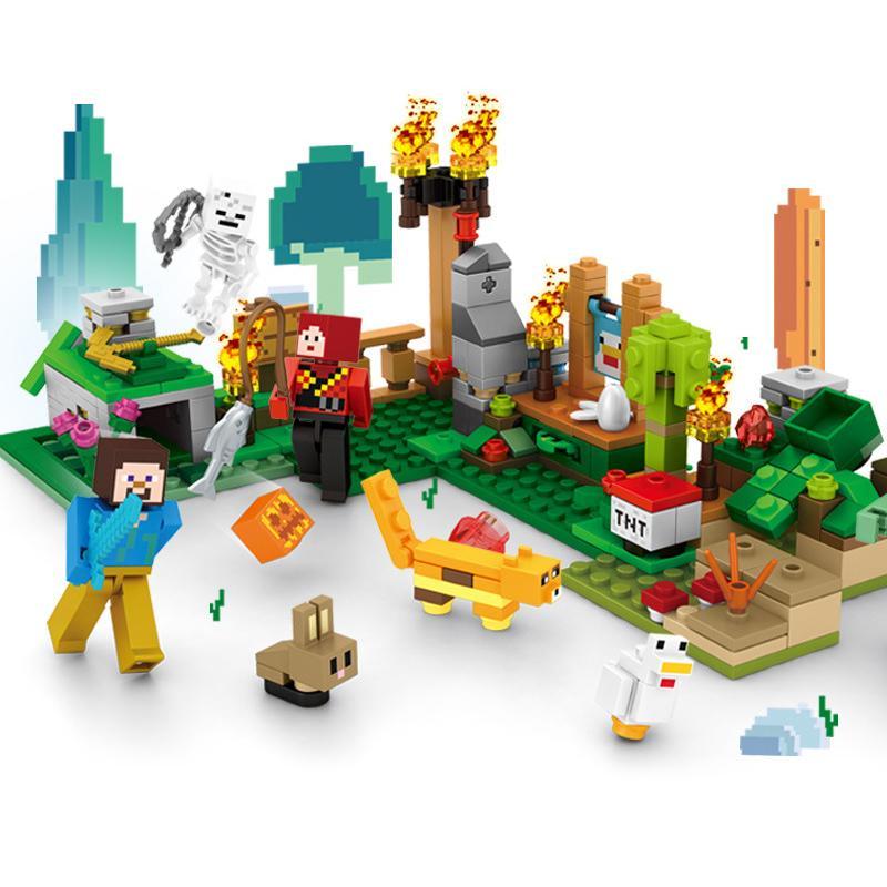 ✅ Bộ đồ chơi này đi kèm với 2 nhân vật minifigures chính là Steve và Alex, cùng với một bộ xương khô và các loài vật đáng yêu như thỏ, mèo, gà, mang đến sự đa dạng cho các kịch bản chơi nhập vai của bé.