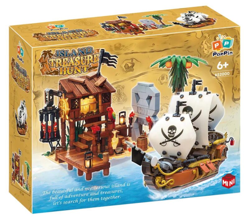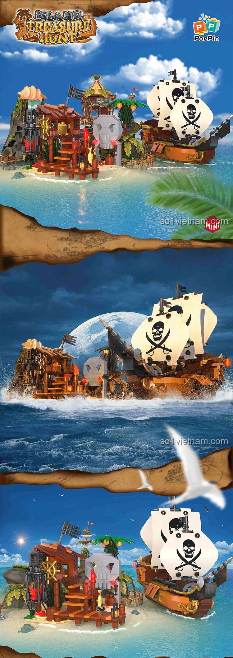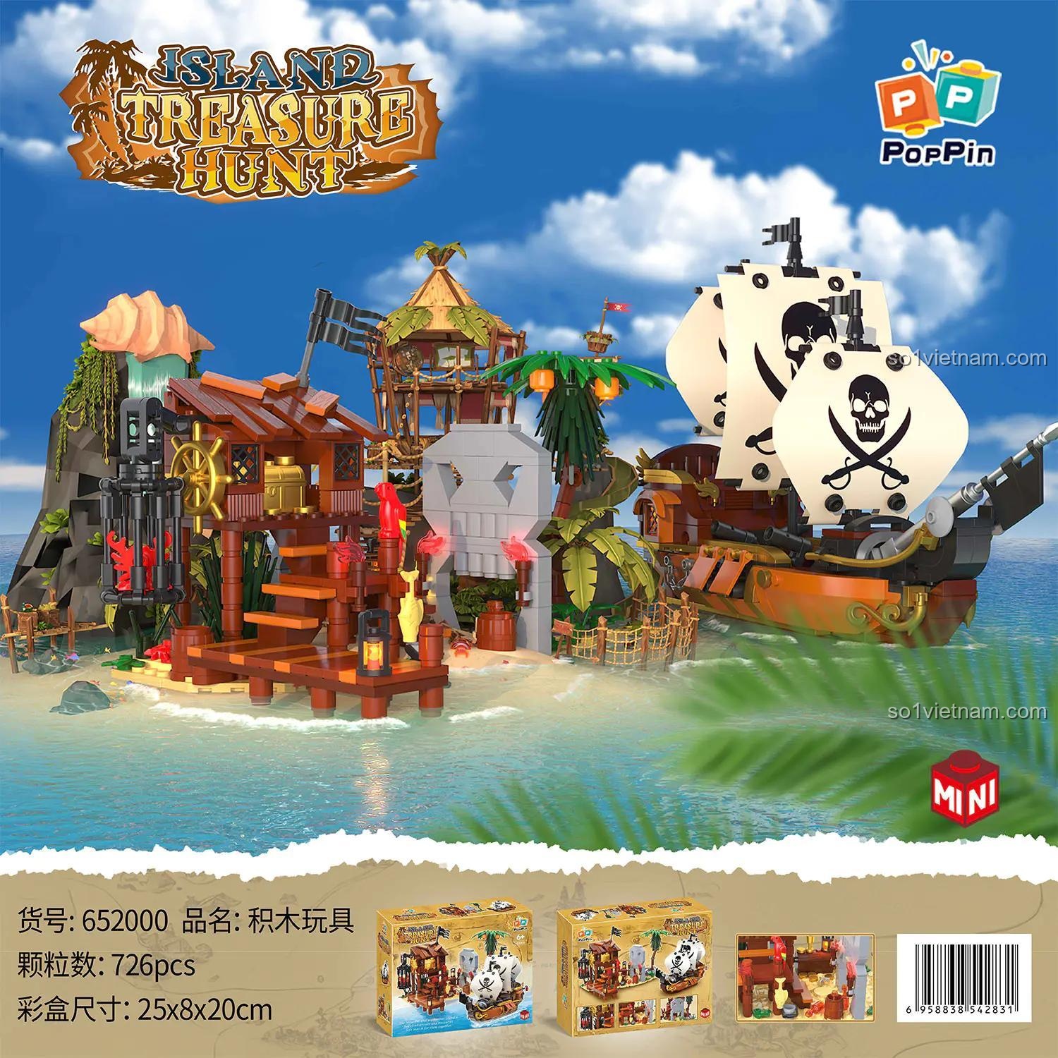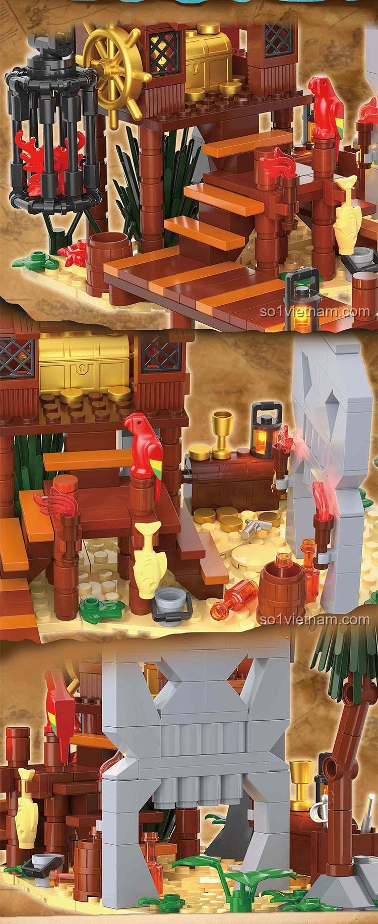 - Hòn Đảo Kho Báu Sinh Động: Bé sẽ được sắp xếp các chi tiết trên đảo, bao gồm nhà kho, cầu tàu, thùng gỗ, và đặc biệt là kho báu được cất giấu kỹ lưỡng, kích thích trí tưởng tượng về những cuộc săn tìm kho báu.