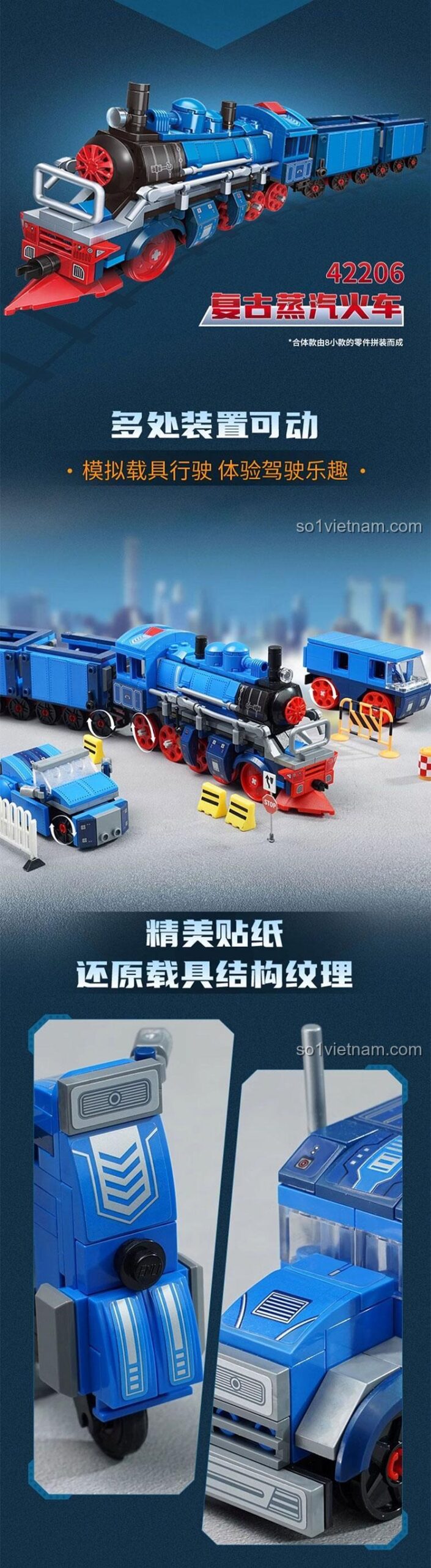 Bộ Lắp Ghép Tàu Hơi Nước Hồi Cổ 8 Trong 1 Enlighten 42206 nổi bật với thiết kế tinh tế và màu sắc hài hòa. Tông màu xanh dương chủ đạo kết hợp với các chi tiết màu đỏ và xám tạo nên vẻ ngoài mạnh mẽ, cổ điển và đầy thu hút. Mỗi mảnh ghép được chế tác tỉ mỉ, đảm bảo độ khít cao, giúp mô hình sau khi hoàn thành trông vô cùng chắc chắn và đẹp mắt.