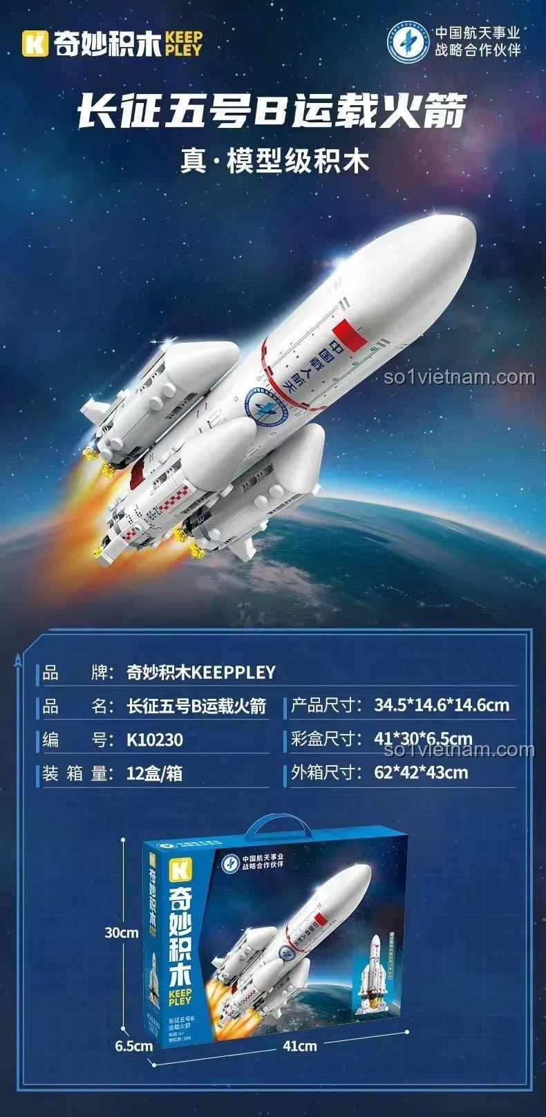 Bộ lắp ghép Keeppley K10230 tái hiện một cách sống động và chi tiết tên lửa đẩy Trường Chinh 5B huyền thoại – niềm tự hào của ngành hàng không vũ trụ Trung Quốc. Với các khối lắp ghép mini block (khối siêu nhỏ) được chế tác tinh xảo, sản phẩm mang đến:
