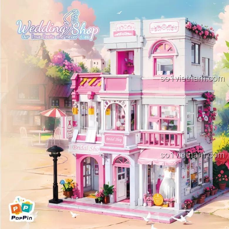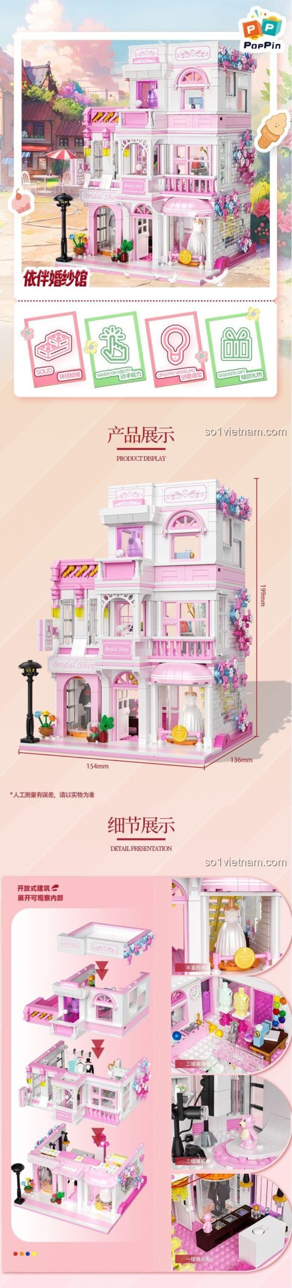 Tiệm Bánh Cưới ZHEGAO 613032 nổi bật với kiến trúc 3 tầng lộng lẫy, khoác lên mình gam màu hồng và trắng chủ đạo, tạo nên một vẻ đẹp ngọt ngào và quyến rũ. Mỗi chi tiết đều được thiết kế tỉ mỉ, từ những ô cửa sổ vòm duyên dáng, ban công lãng mạn đến những chùm hoa tươi tắn điểm xuyết xung quanh tòa nhà. Mô hình có kích thước ấn tượng với chiều dài 15.4cm, chiều rộng 13.6cm và chiều cao 19.9cm, đủ lớn để trở thành điểm nhấn trang trí cho căn phòng của bé.