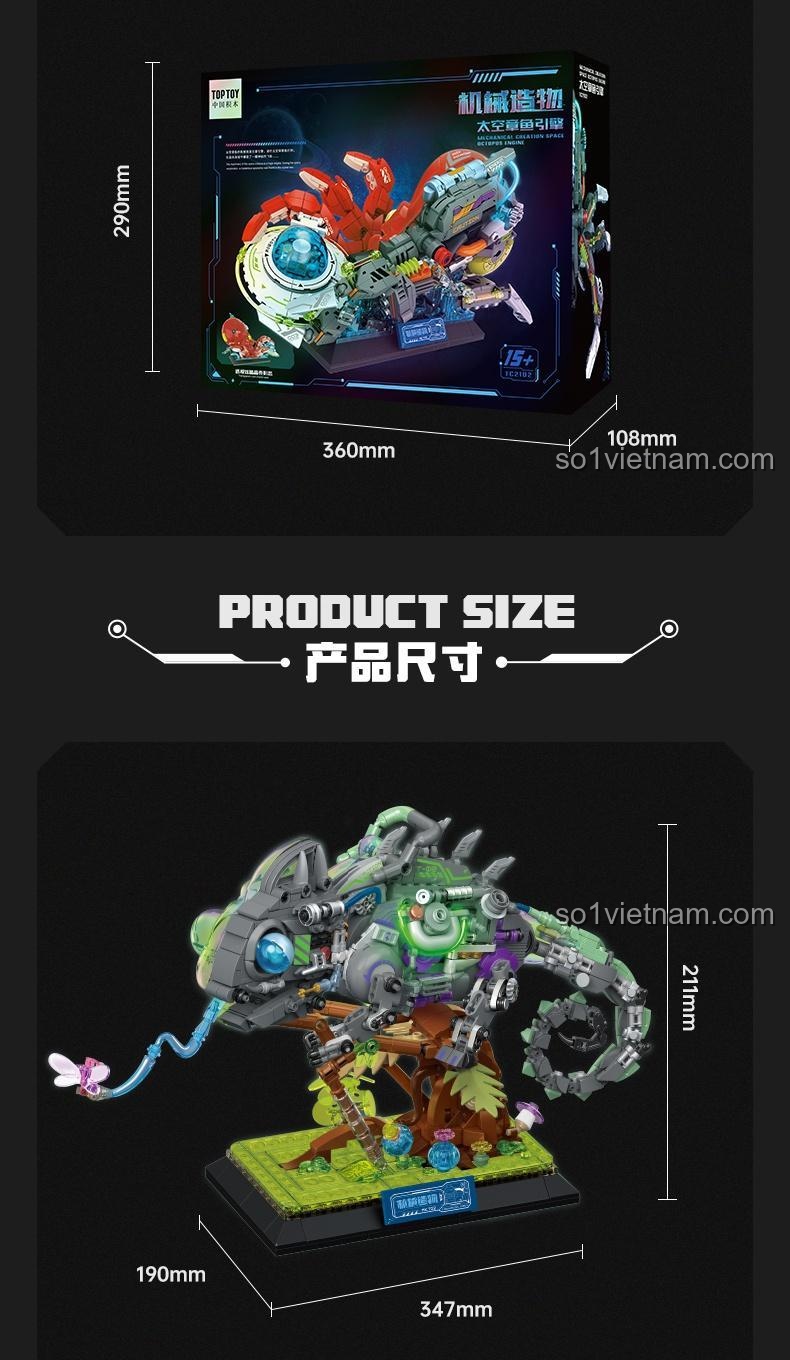 TOP TOY TC2101 Biến Thể Cơ Khí Tắc Kè Hoa Neon gây ấn tượng mạnh mẽ với thiết kế bán giải phẫu độc đáo, cho phép bạn chiêm ngưỡng cả vẻ ngoài mạnh mẽ và cấu trúc cơ khí phức tạp bên trong. Mô hình Tắc Kè Hoa Cơ Khí này được khoác lên mình những màu sắc chủ đạo như xanh lá, xám và tím, tạo nên vẻ ngoài vừa hiện đại vừa bí ẩn, đúng chất của một sinh vật neon. Với chiều dài mô hình lên đến 34.7 cm, chiều rộng 19 cm và chiều cao 21.1 cm, đây là một tác phẩm trưng bày hoành tráng, thu hút mọi ánh nhìn. Từng chi tiết được chăm chút tỉ mỉ, từ đôi mắt robot sắc sảo, những chiếc gai phòng thủ trên lưng, đến chiếc lưỡi bắt mồi co giãn đầy linh hoạt và chiếc đuôi cơ khí có thể uốn lượn. Tất cả tạo nên một mô hình robot tắc kè hoa sống động, thể hiện sự kết hợp hoàn hảo giữa vẻ đẹp tự nhiên và kỹ thuật tiên tiến.