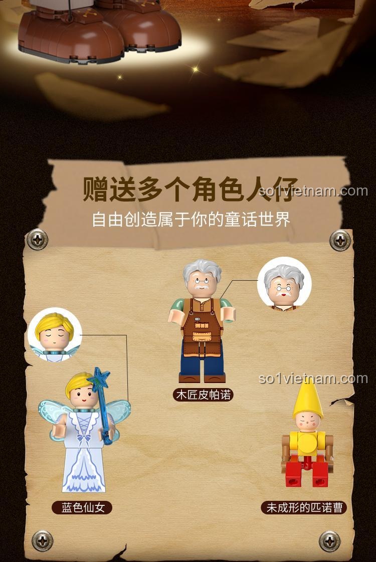 • Thêm nhân vật: Kết hợp với các minifigure từ các bộ đồ chơi khác để tạo ra nhiều nhân vật phụ hơn trong câu chuyện của Pinocchio.