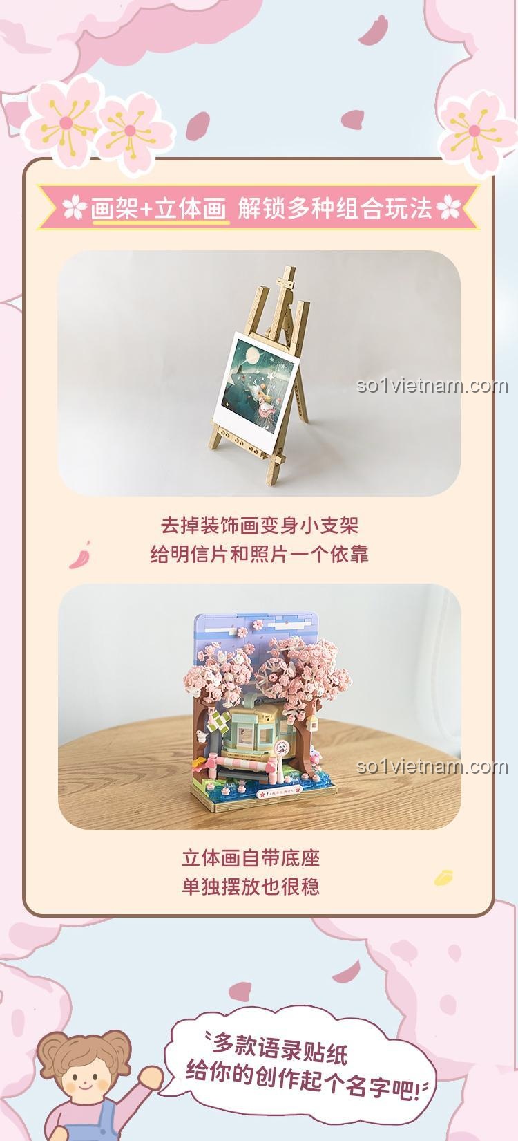 Không chỉ vậy, thiết kế khung tranh 3D còn cho phép bé tháo rời mô hình khỏi giá vẽ để trưng bày độc lập trên bàn hoặc kệ. Đặc biệt, phần giá vẽ có thể biến hóa thành một giá đỡ tiện lợi cho những tấm bưu thiếp hay ảnh kỷ niệm yêu thích của bé. Đây là một tính năng vô cùng sáng tạo, giúp bé tận dụng tối đa món đồ chơi của mình. Tàu Hỏa Hoa Anh Đào Wekki không chỉ là đồ chơi mà còn là một vật trang trí đa năng, mang lại niềm vui và sự tiện ích.